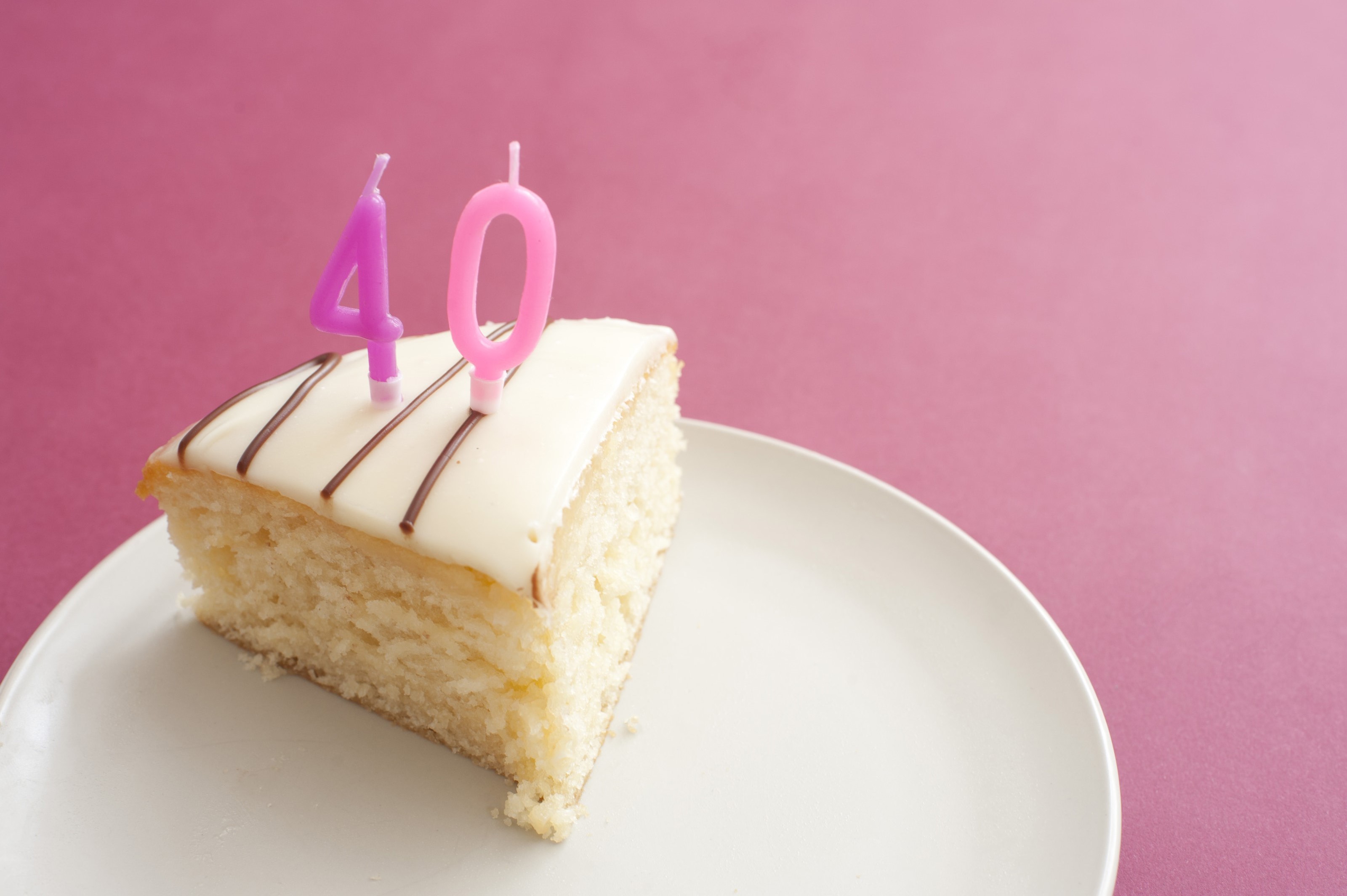 Image Description: Slice of cake with burning 40th birthday candles served on a plate over a pink background with copysace