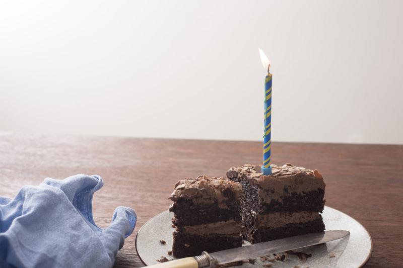 Image Description: Remnants of a tasty freshly baked chocolate birthday cake with single burning blue candle and knife on a table with napkin and copy space