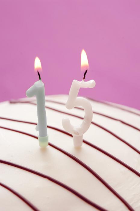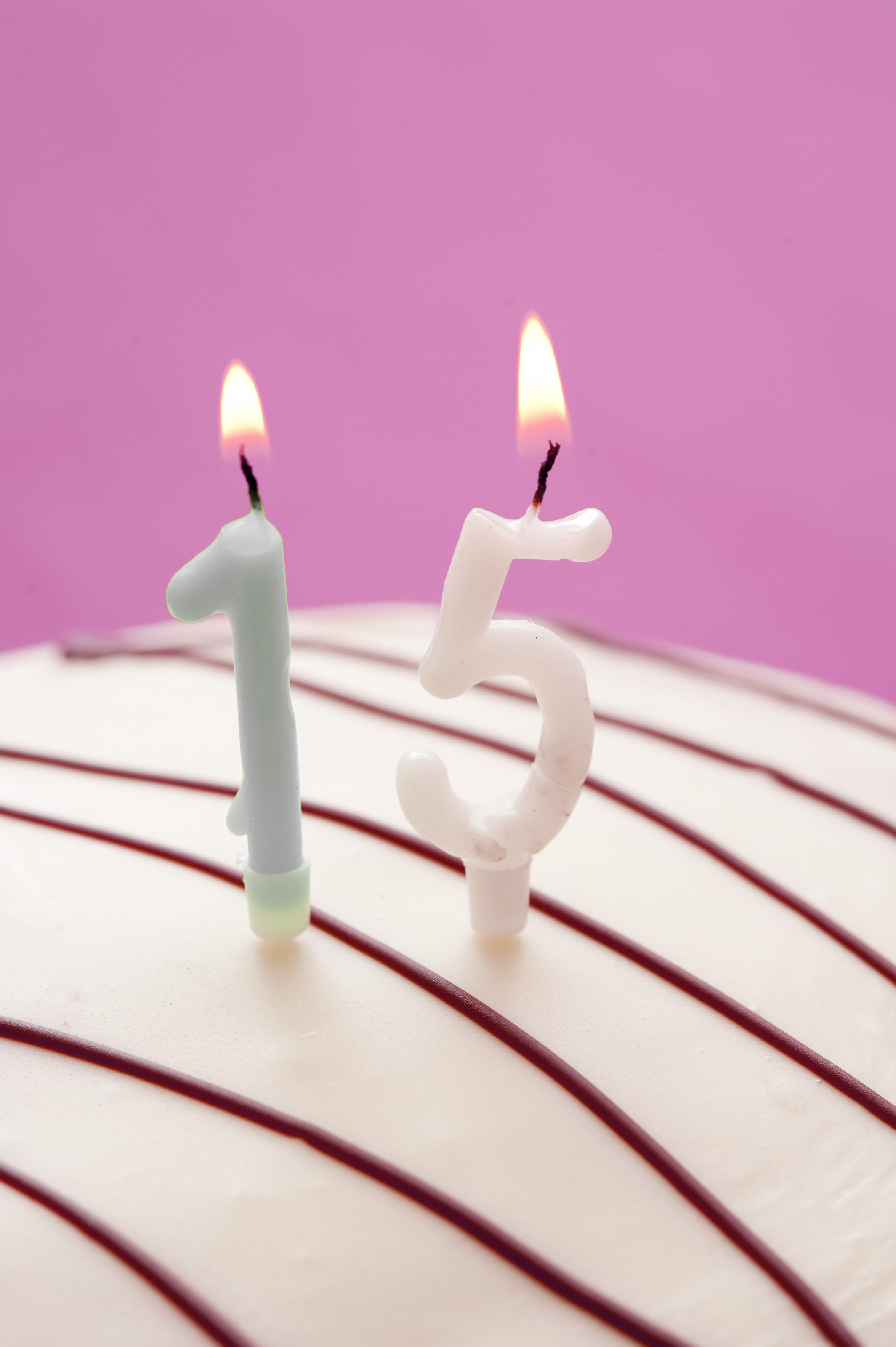 Image Description: Decorative numeric burning candles for 15th birthday on top of the icing of a glazed birthday cake over a pink background