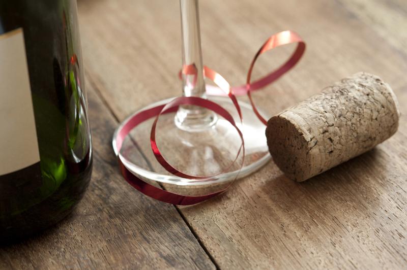 Image Description: Champagne party background with cork lying on a wooden table beside a bottle and glass decorated with a curled red ribbon