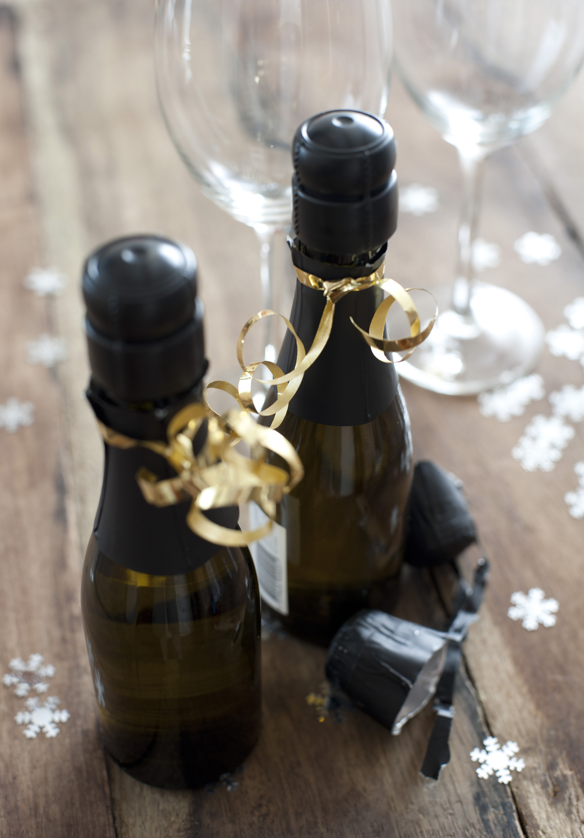 Image Description: Two Miniature Bottles of Champagne Tied with Gold Ribbon Surrounded by Glasses and Snowflake Confetti for Christmas or New Years Celebration