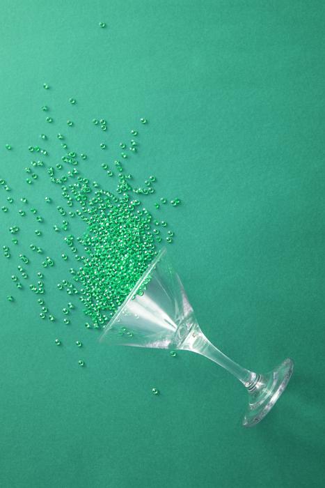 Image Description: Colorful green cocktail background with copy space conceptual of a party with sprinkled beads spilling from an upturned martini glass