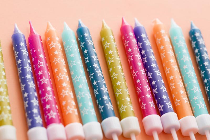 Image Description: Row of colorful decorative party candles with a star pattern on a muted orange background , close up high angle view