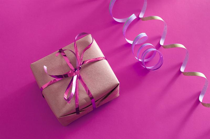 Image Description: Birthday gift for a girl with a gift wrapped box tied with a pink ribbon and streamer over a pink background, high angle view