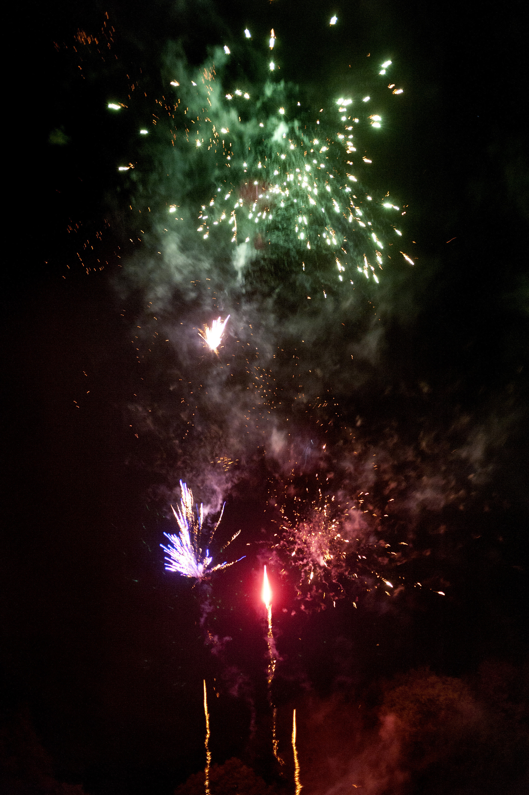 Image Description: Colourful pyrotechnics display to celebrate a special occasion withpink, green and red fireworks exploding in the night sky