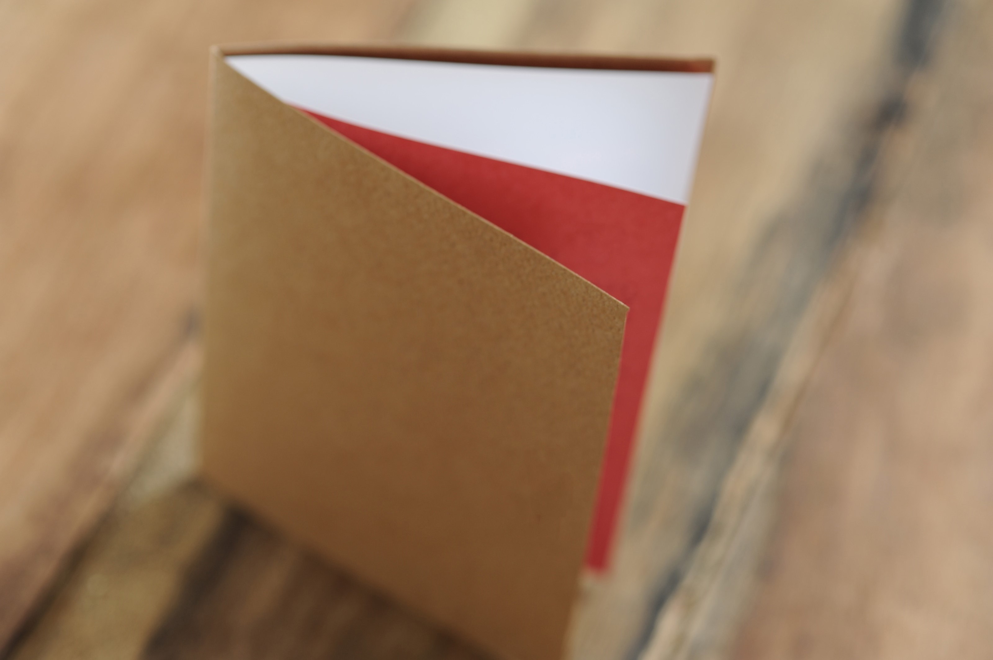 Image Description: Close up Empty Brown Homemade Party Invitation Card Standing on Top of a Wooden Table
