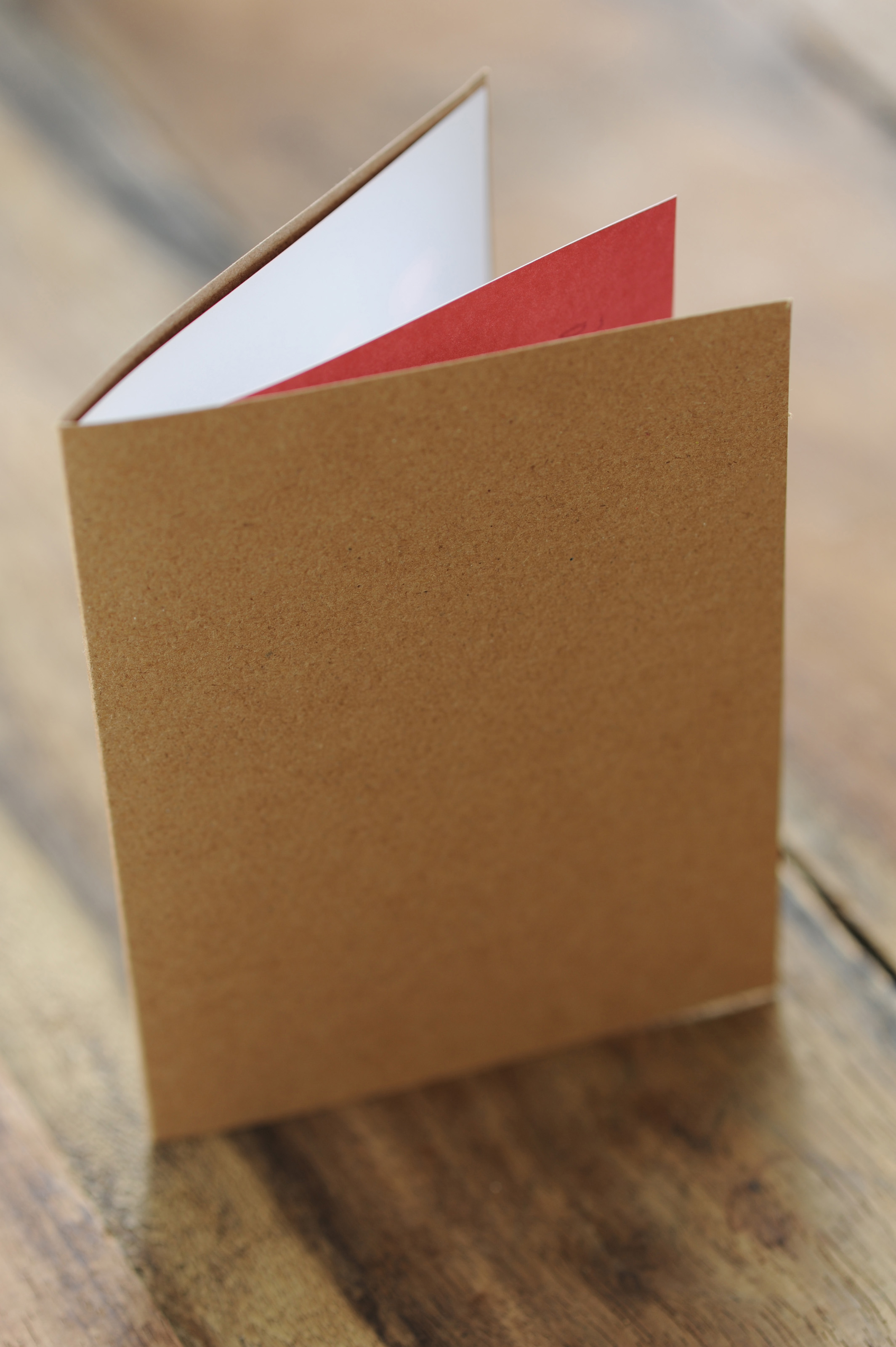 Image Description: Close Up of Blank Greeting Card or Invitation Made from Natural Paper on Outside and White and Red Paper Inside on Wooden Surface