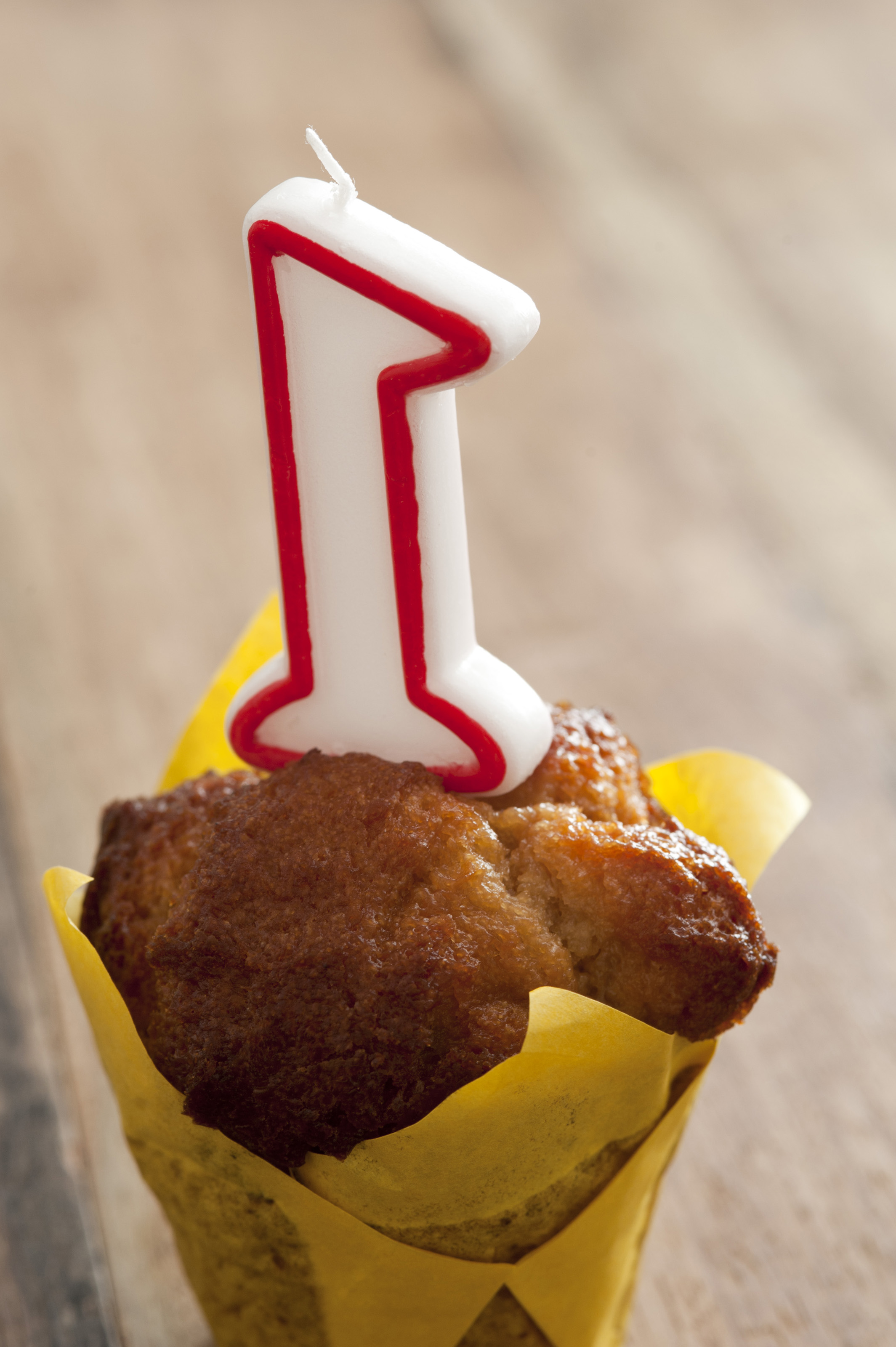 Image Description: Close Up of Number One Candle Inserted in Muffin or Individual Cake Wrapped in Yellow Paper for First Birthday