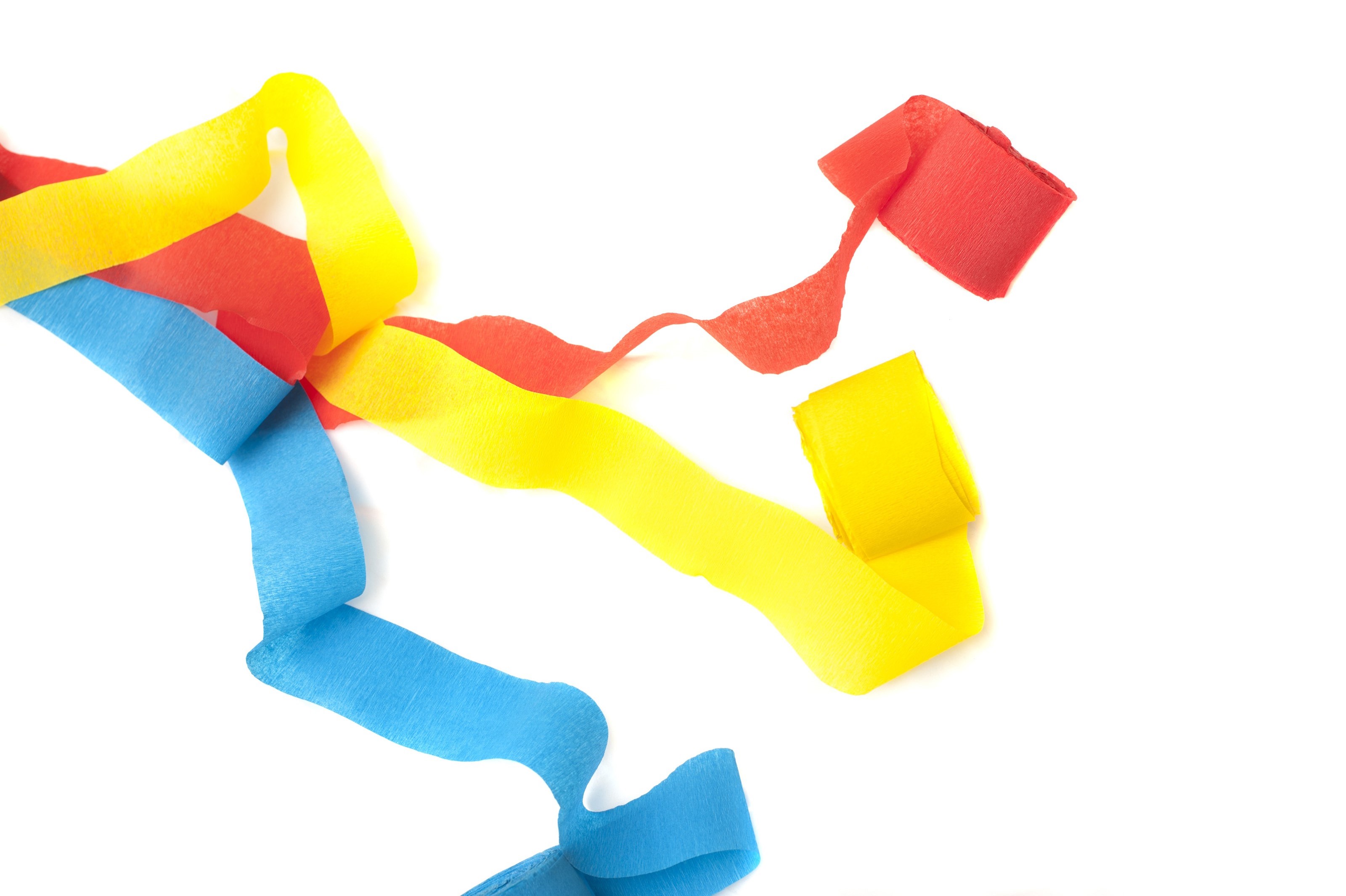 Image Description: Three vibrant colourful paper streamers in red, yellow and blue for a party, carnival or festive occasion on a white background