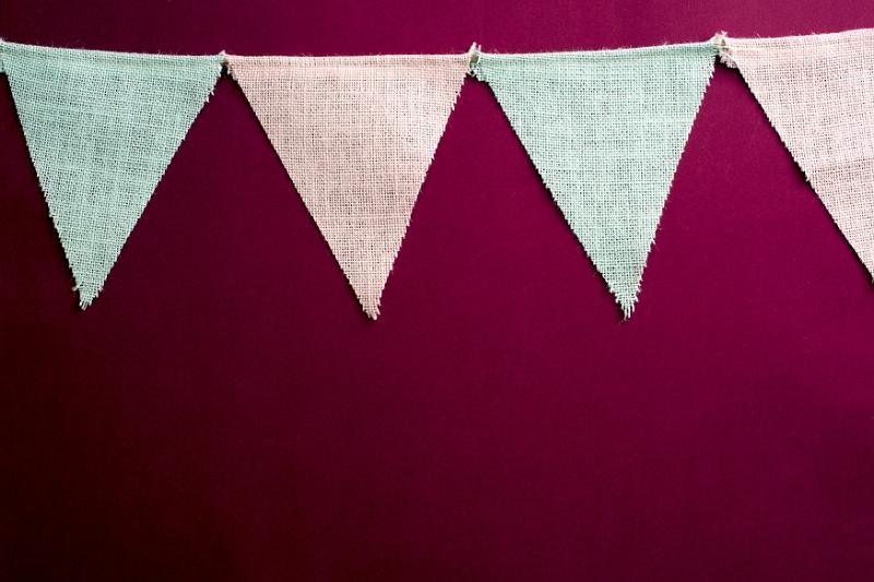 Image Description: Party bunting textile triangular flags on a string in close-up on dark red wall, as decoration background design