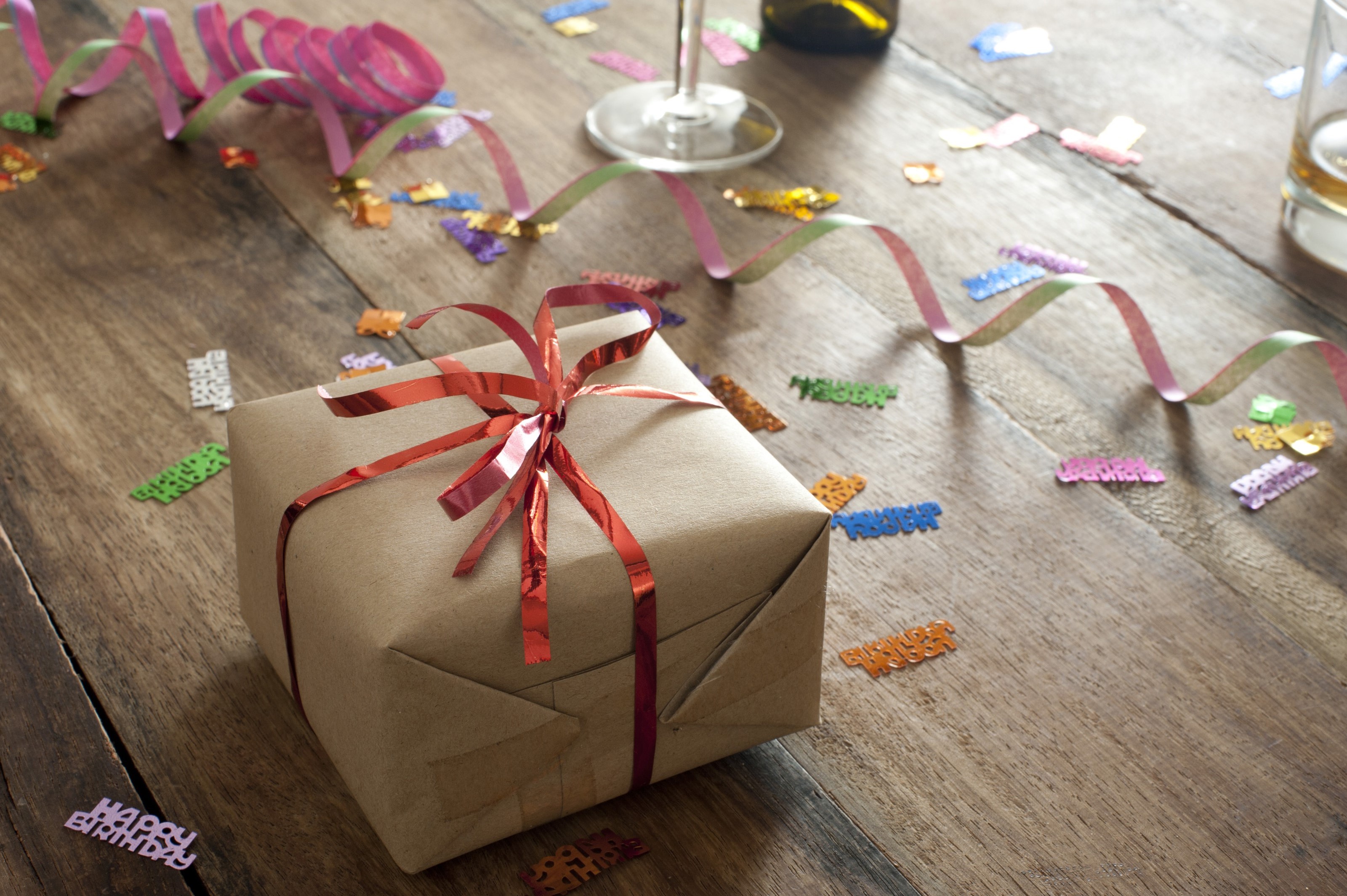 Image Description: Party gift with a decorative red ribbon bow lying on a wooden table with colorful streamers and confetti for a festive celebration