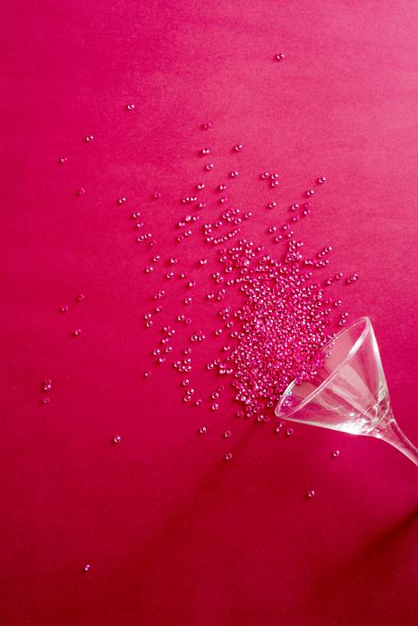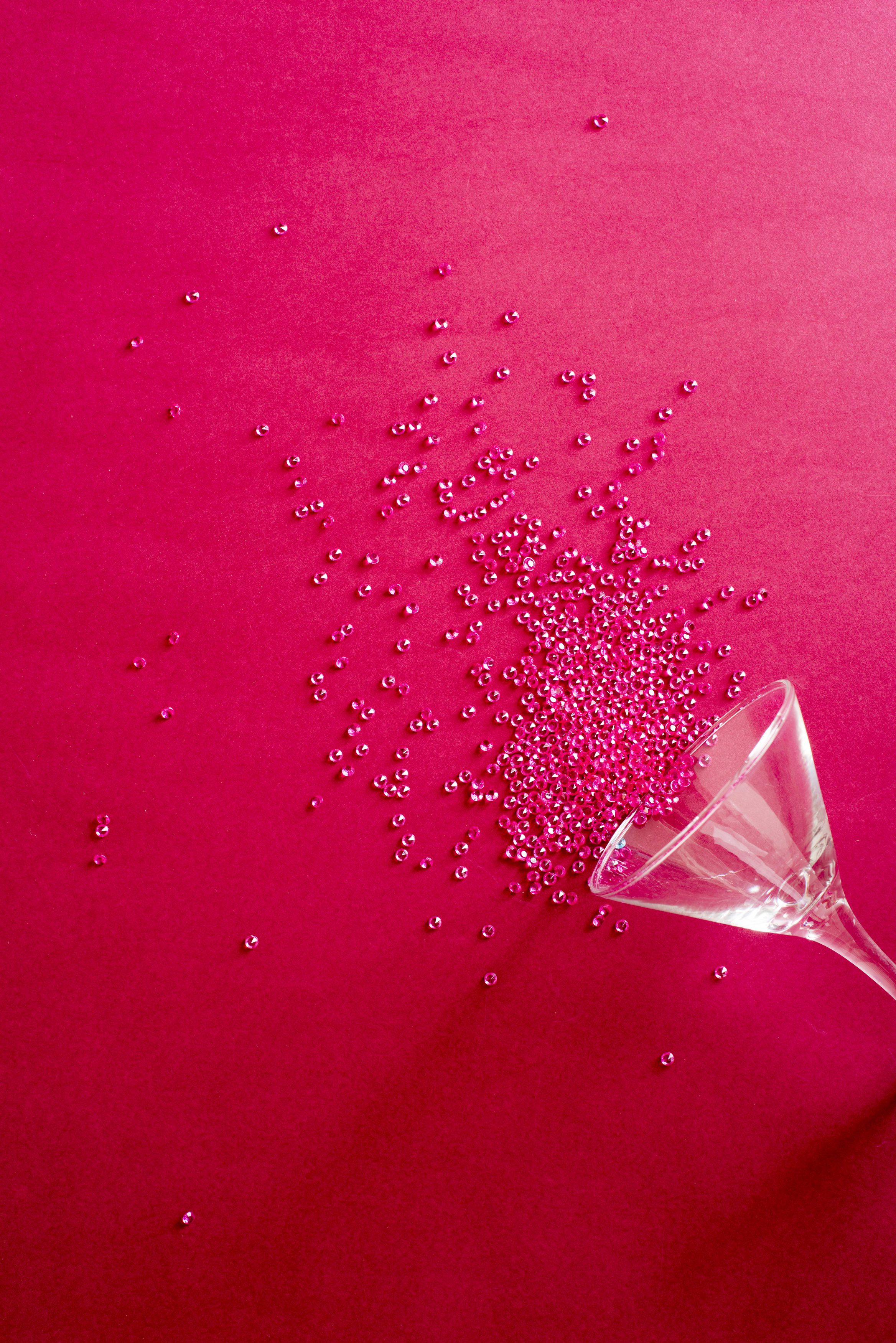 Image Description: Festive red party background with upended cocktail glass spilling sparkling red beads onto a matching background with copy space