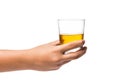 Image Description: Glass of neat golden malt whiskey served straight conceptual of relaxation, a bar or pub, viewed at a tilted angle on white