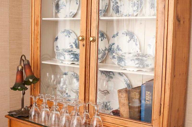 Image Description: Vintage crockery in a wood and glass display case with old leather books and elegant glassware stacked alongside an Art Nouvea Lamp on the outside shelf