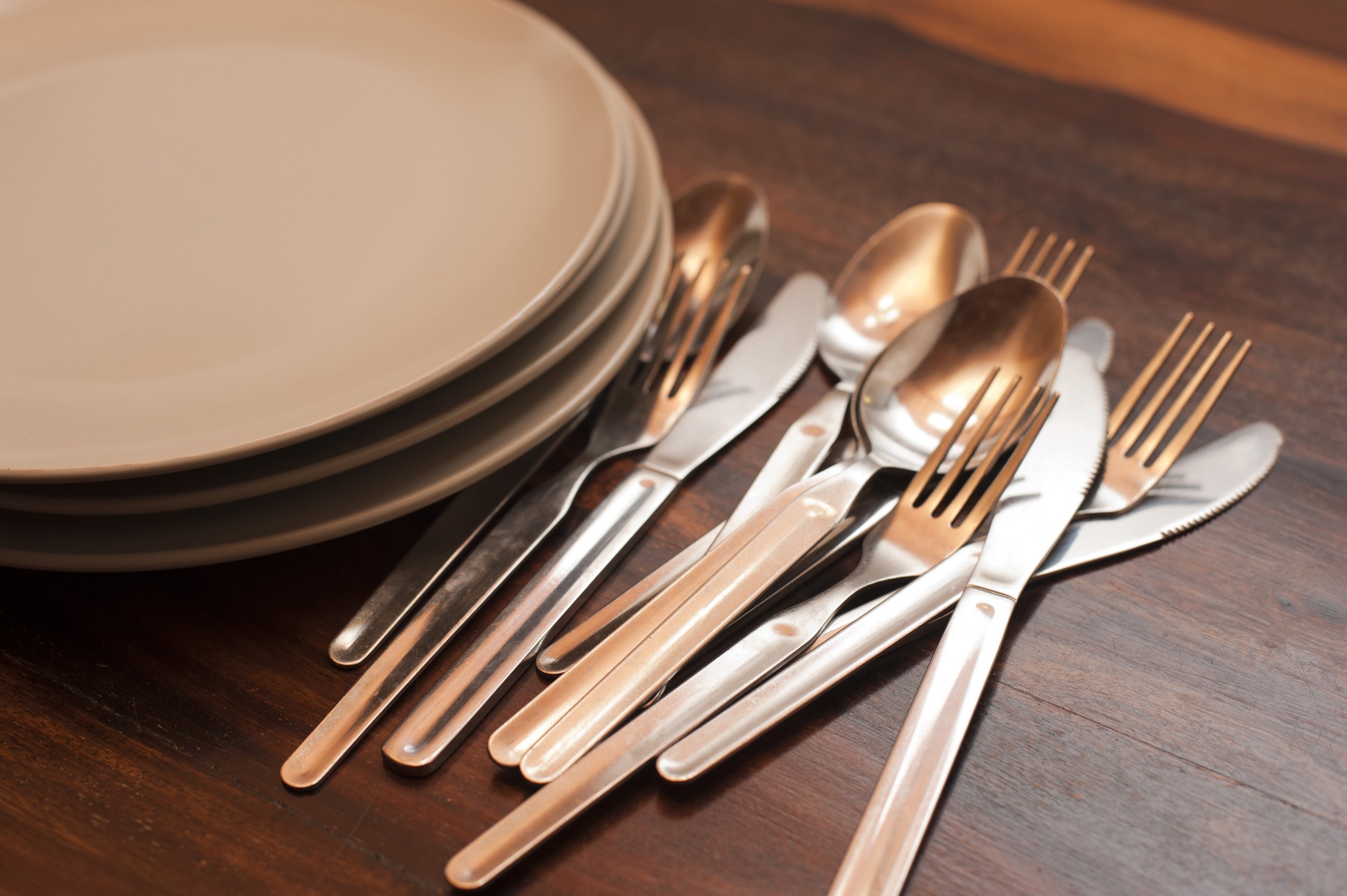 Image Description: Loose cutlery and a stack of empty plates on a buffet table with knives, forks and spoons on a wooden tabletop