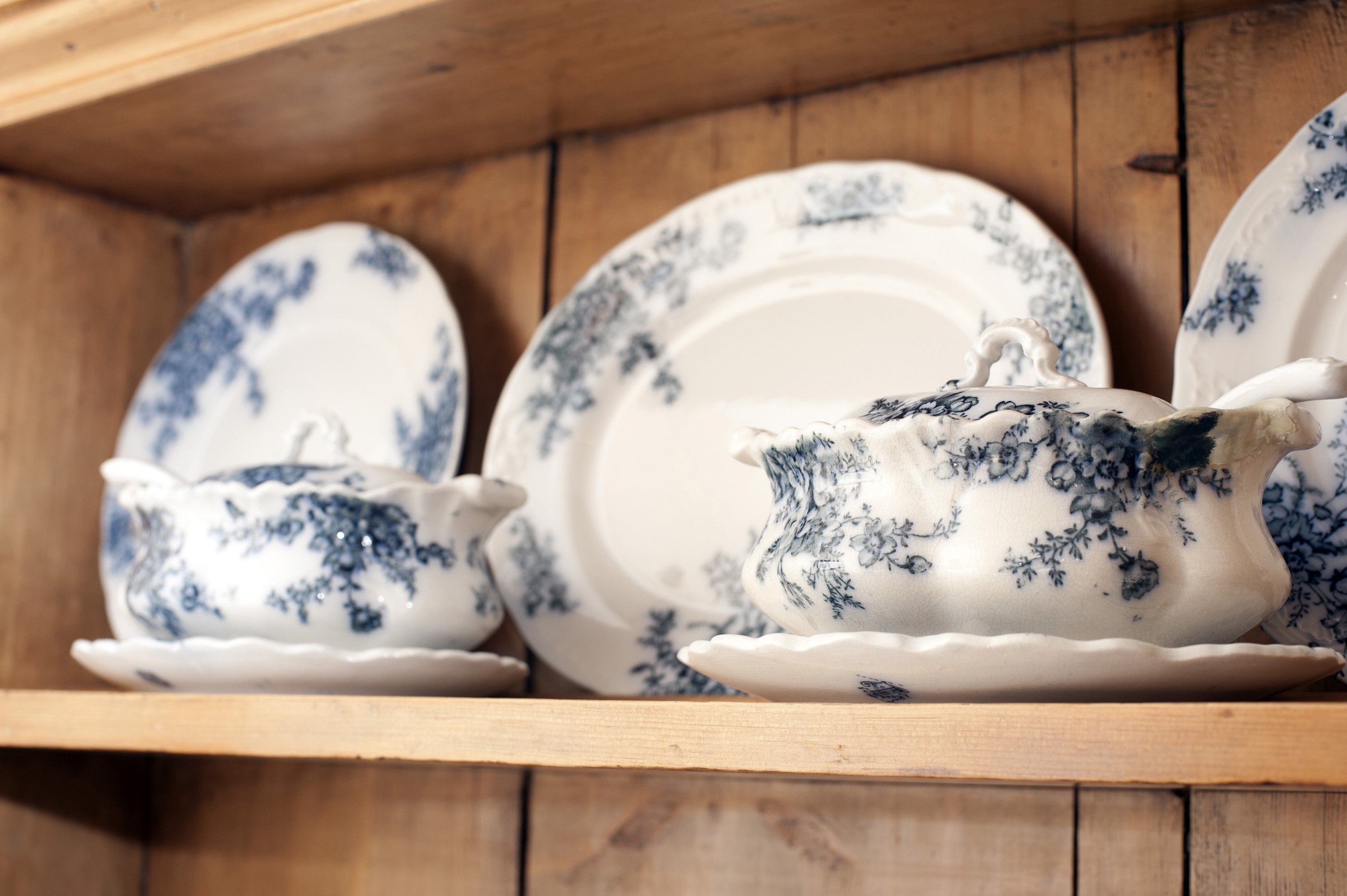 Image Description: Close up of sauce boats and dinner plates in blue and white crockery on a wooden dresser