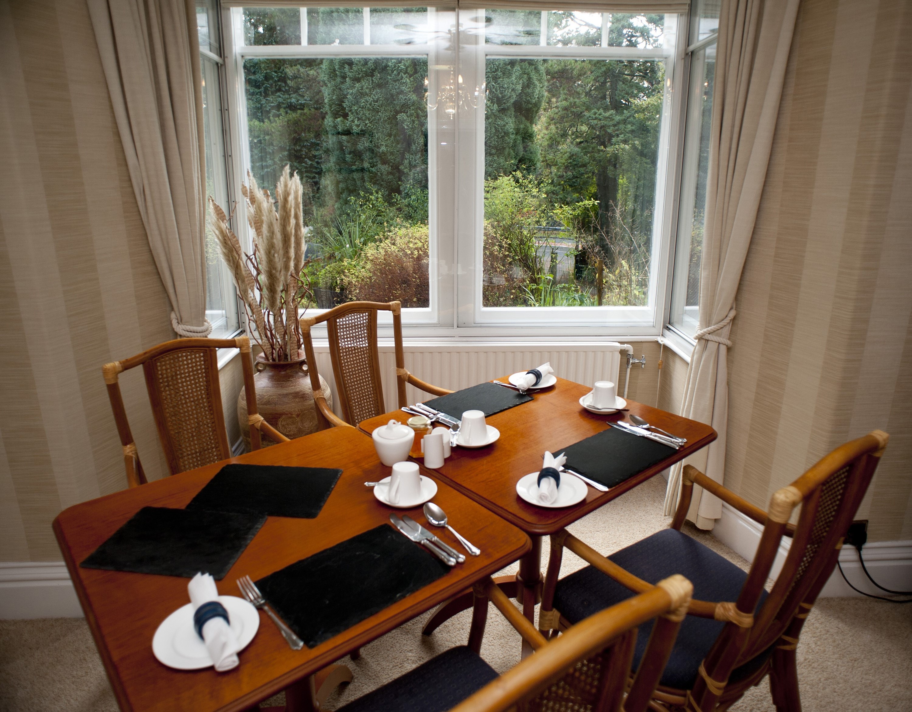 Image Description: Stylish wooden dining table set for three people for breakfast with cutlery and crockery alongside a view window overlooking shrubs