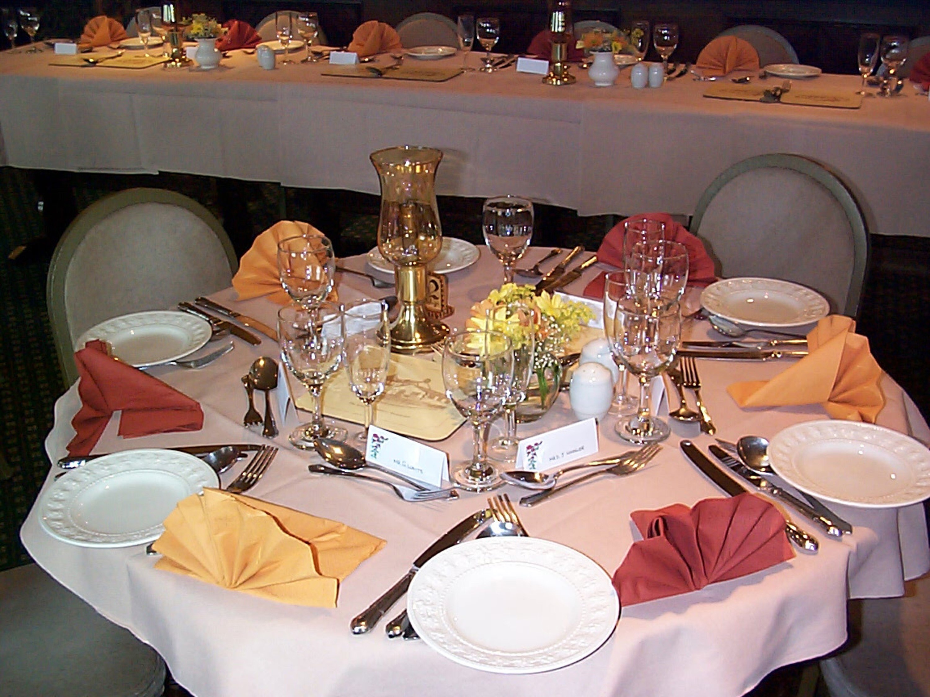 Image Description: Elegant dining table at a catered event set with six place settings with luxury linen, silverware , name cards and white plates