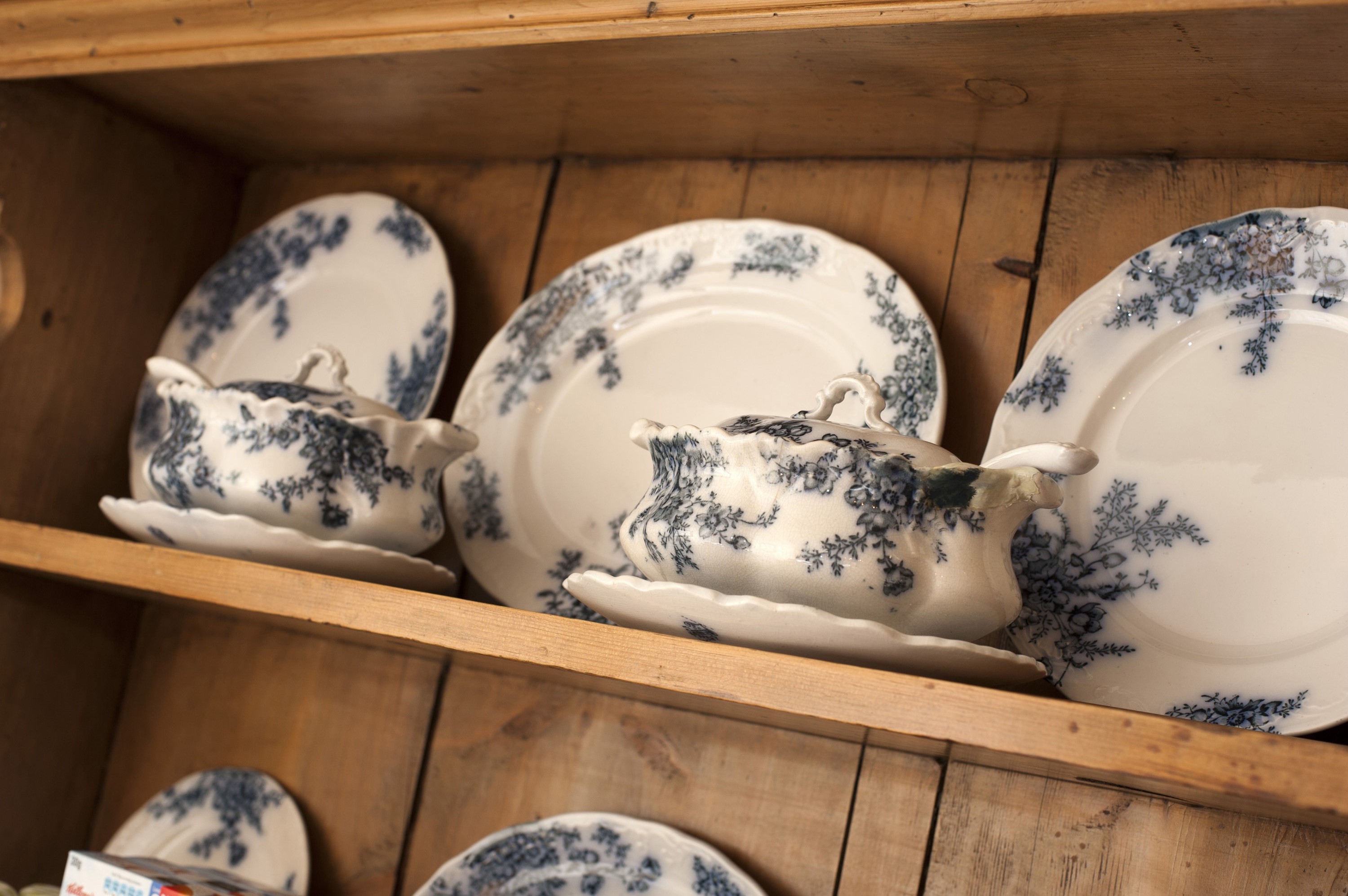Image Description: Blue and white dinner service displayed on the shelves of a rustic wooden dresser with plates and sauce boats