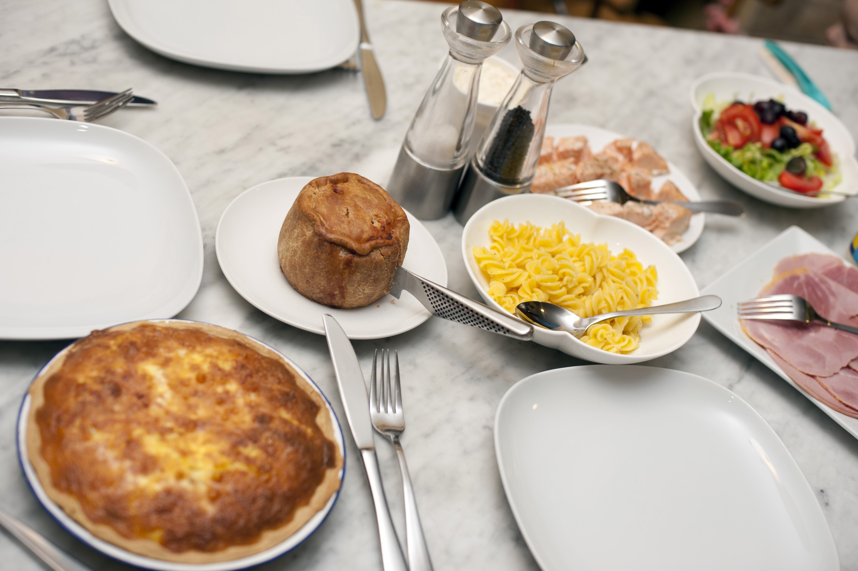 Image Description: a marble dining table with a selection of cold pies and meats