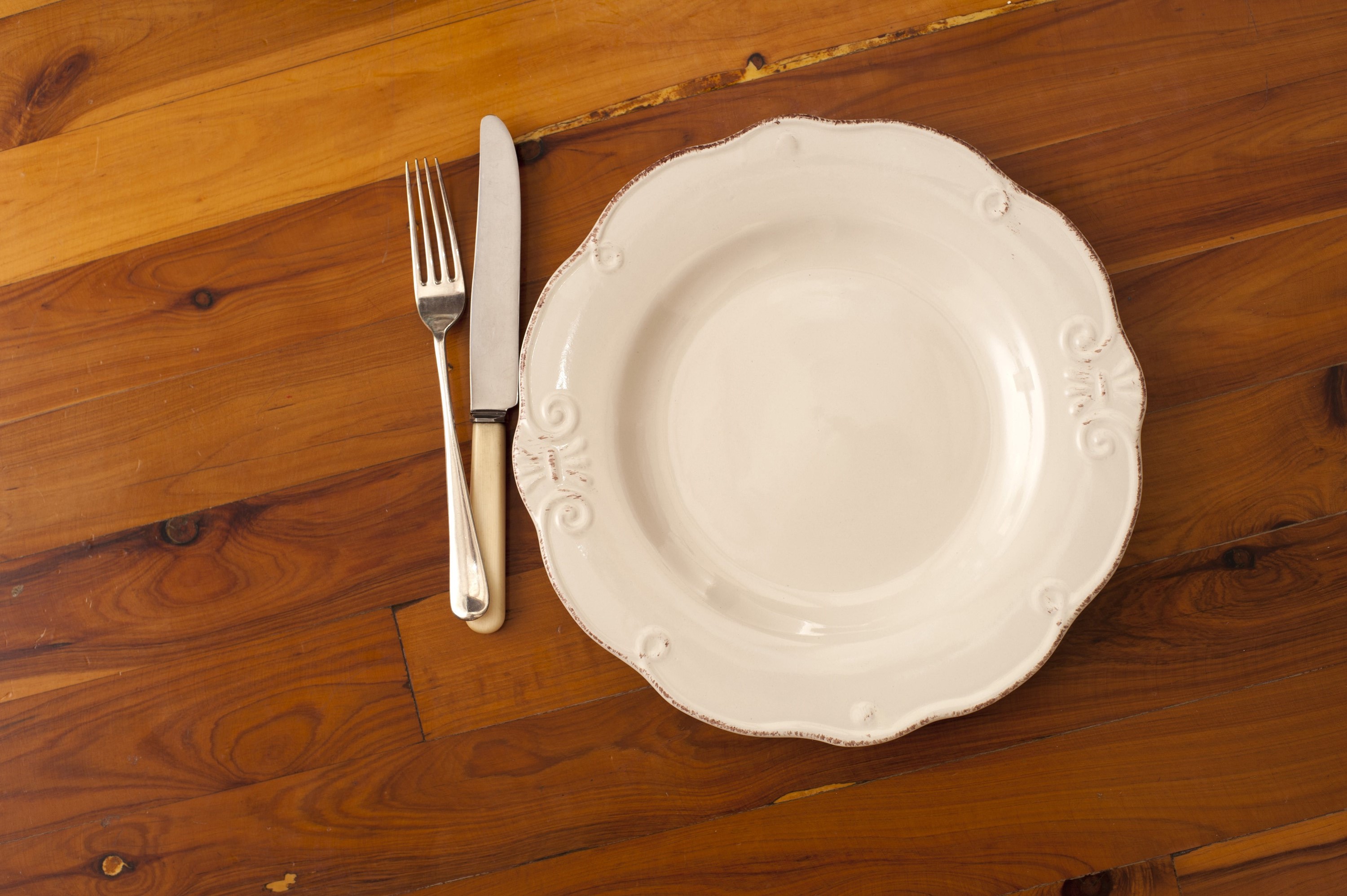 Image Description: Overhead view of an empty white plate and cutlery on a wooden dining table with decorative wood grain, copyspace