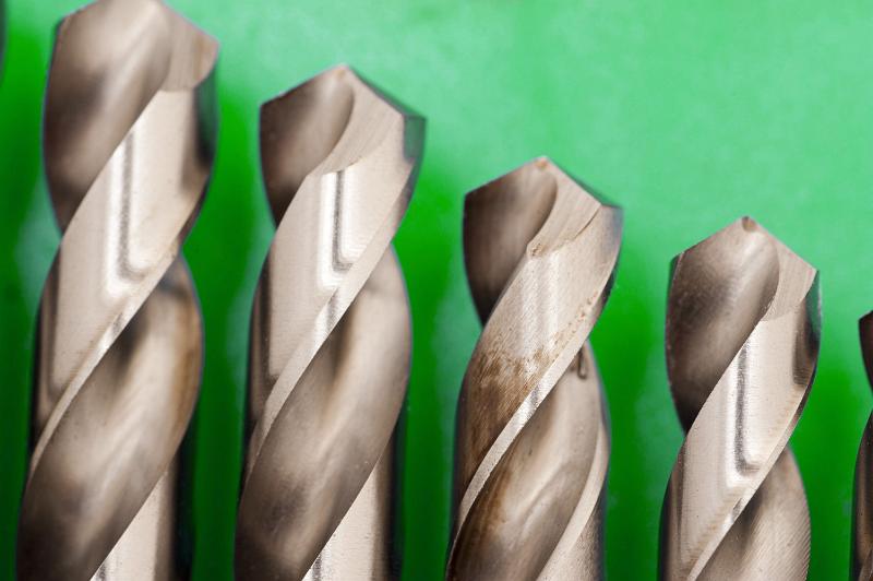 Image Description: Close up of the tips of a set of metal steel spiral woodworking drill bits in descending size on a green background with copyspace