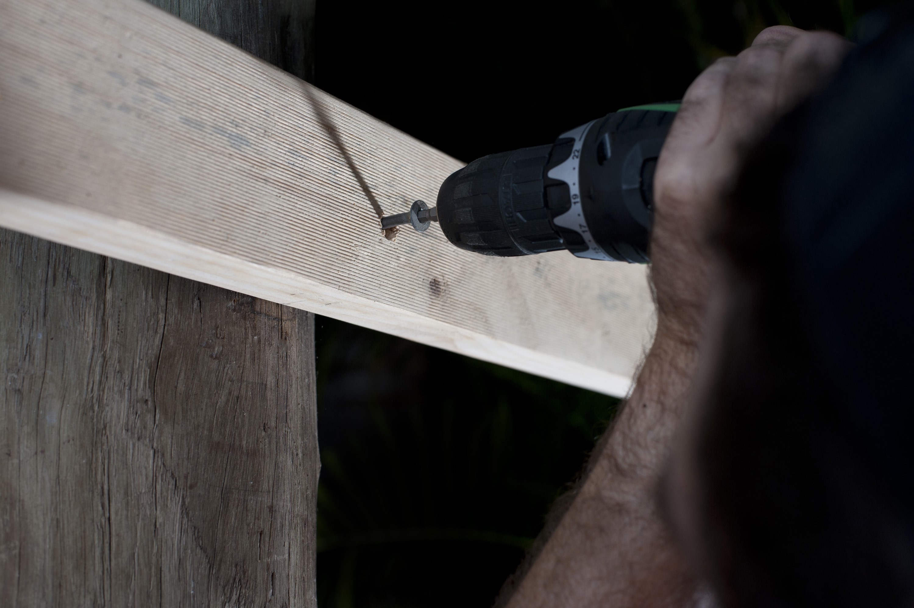 Image Description: Man fixing wood to a support with a screw using a screwdriver attachment on his electric drill, close up of his hand and the drill bit