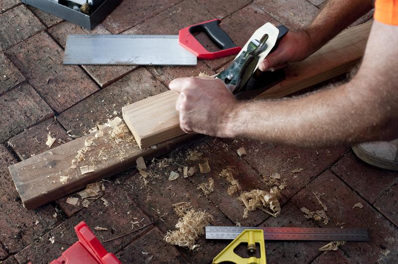 Image Description: Joiner planing a plank of wood on a workshop floor during a house renovation project as he installs a kitchen and cabinets