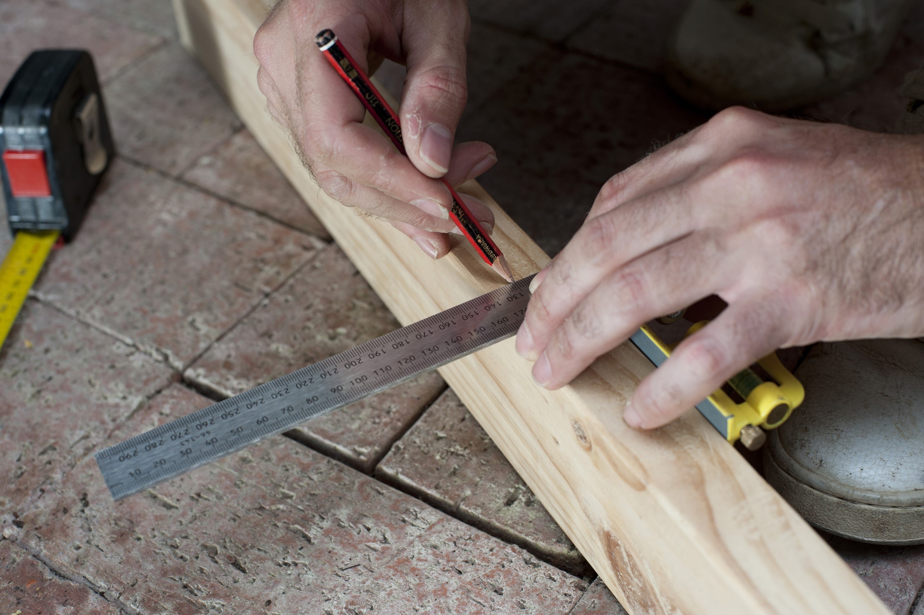 Image Description: Man marking a square for a right angle cut on a plank of wood in his woodworking workshop as he renovates his home