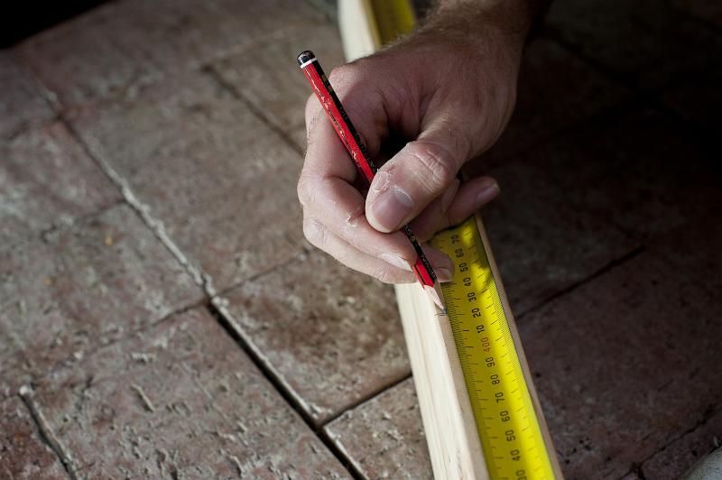 Image Description: Measuring the length of a plank of wood using a builders tape measure and pencil, close up of the carpenters hand