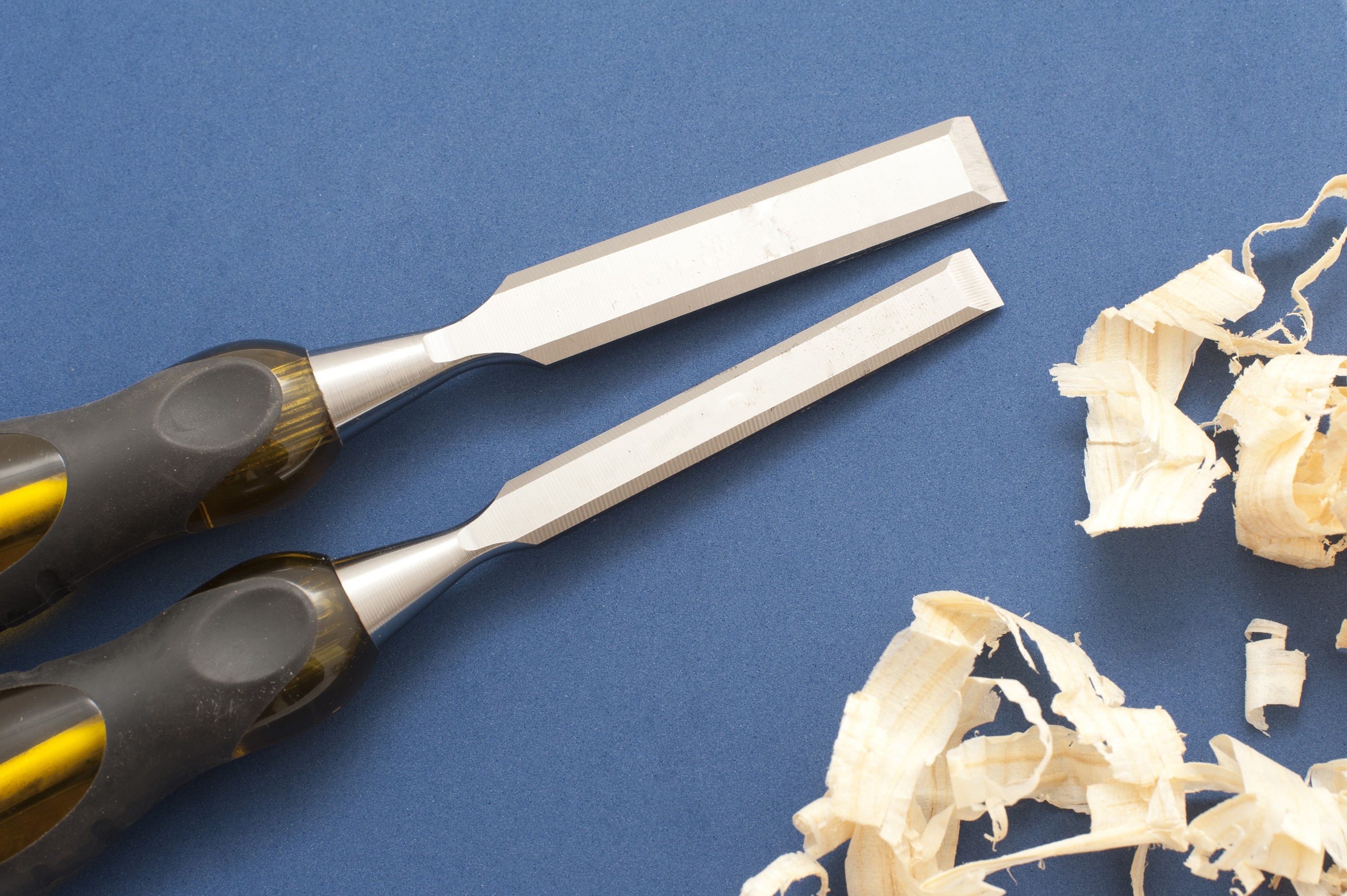 Image Description: Two woodworking chisels with different sized steel blades lying side by side on a blue background with fresh wood shavings