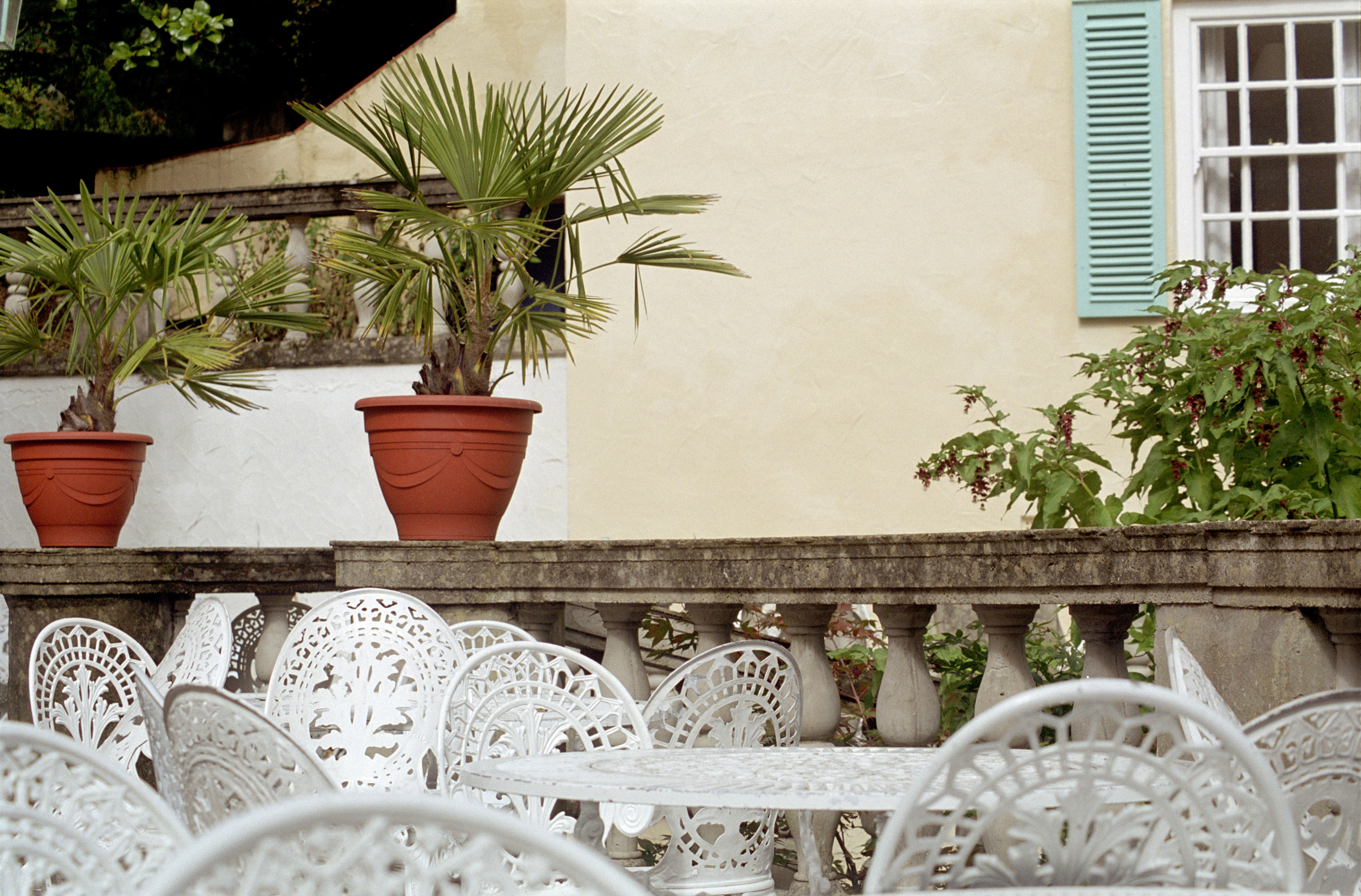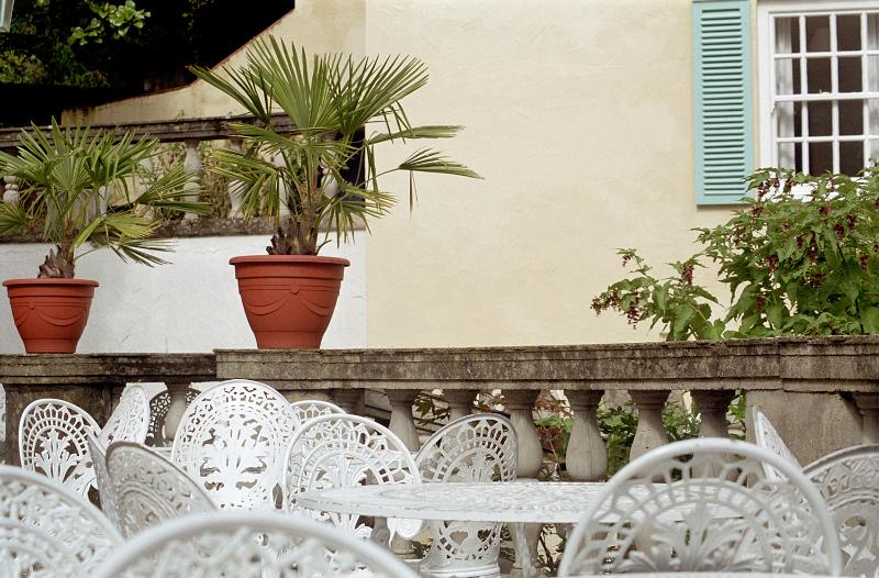 Image Description: Potted palm trees on a patio with ornate white outdoor furniture in front of a building with shutters on the windows