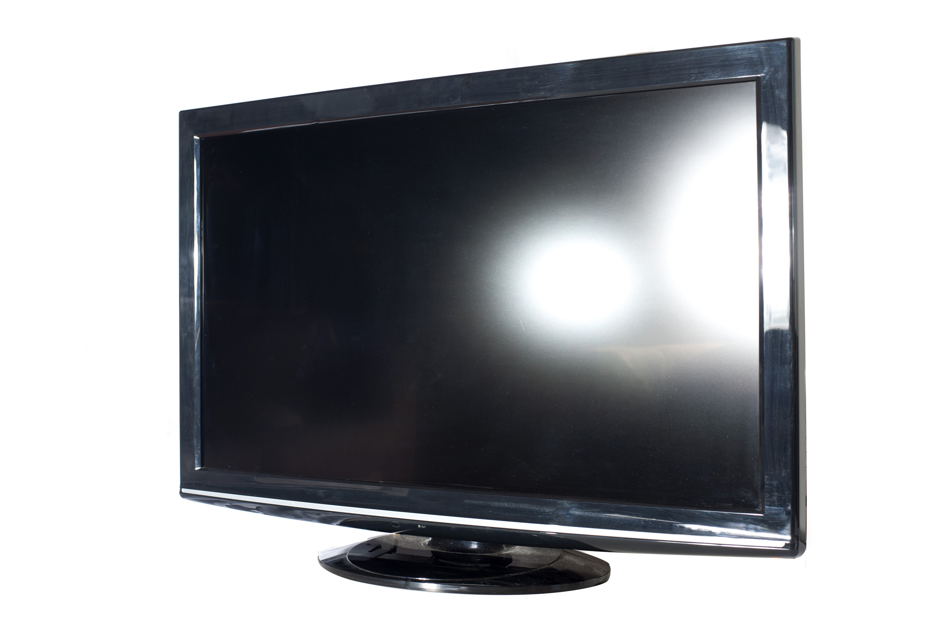 Image Description: Close up Brand New Black Modern 32 Inch LCD Television Isolated on a White Background