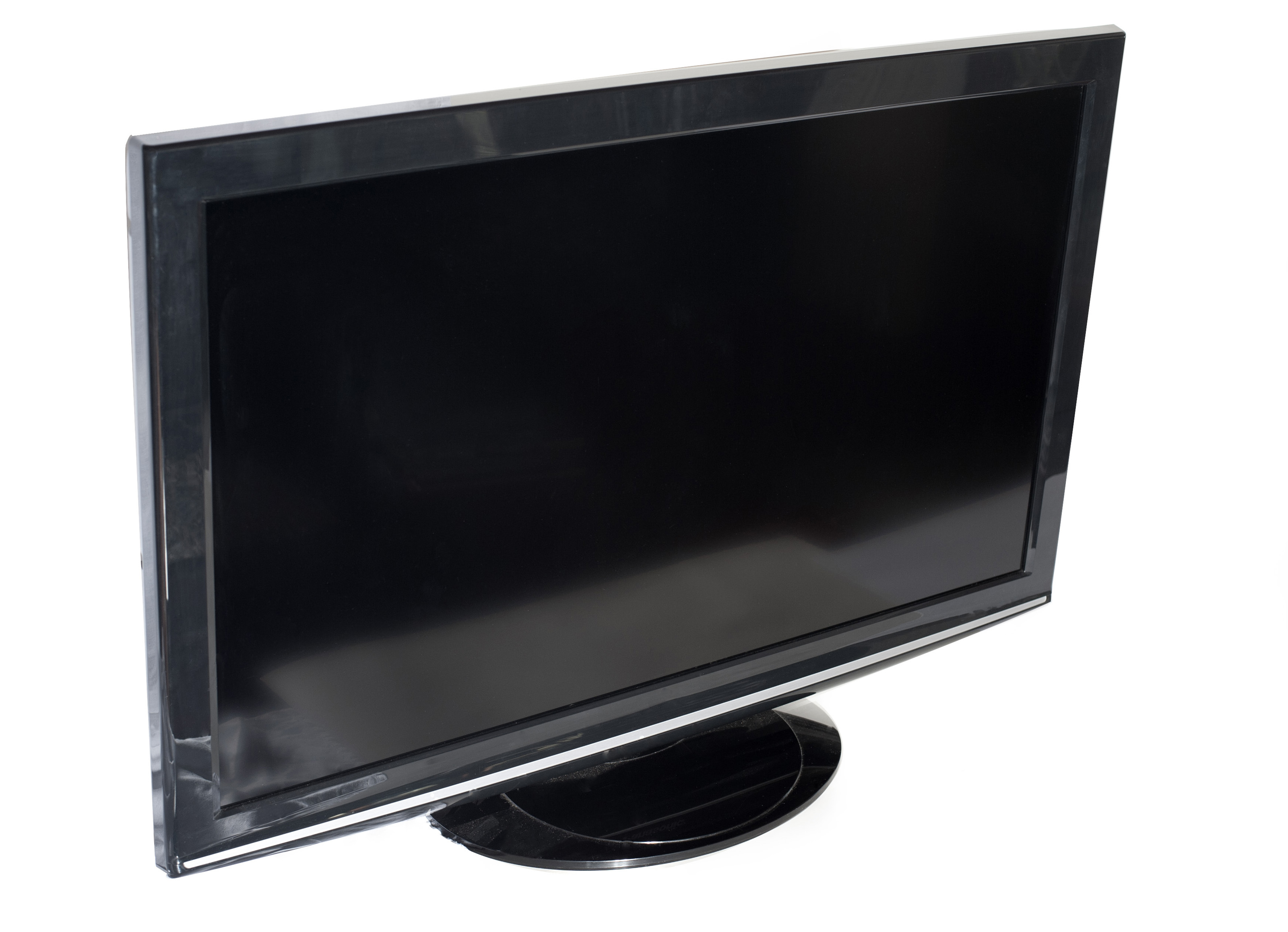 Image Description: Modern flat black TV set or PC monitor with wide LCD screen turned off, close-up with copy space on white