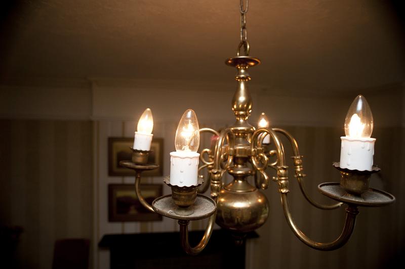 Image Description: Illuminated brass chandelier with classic candle-style arms hanging from the ceiling in a darkened room