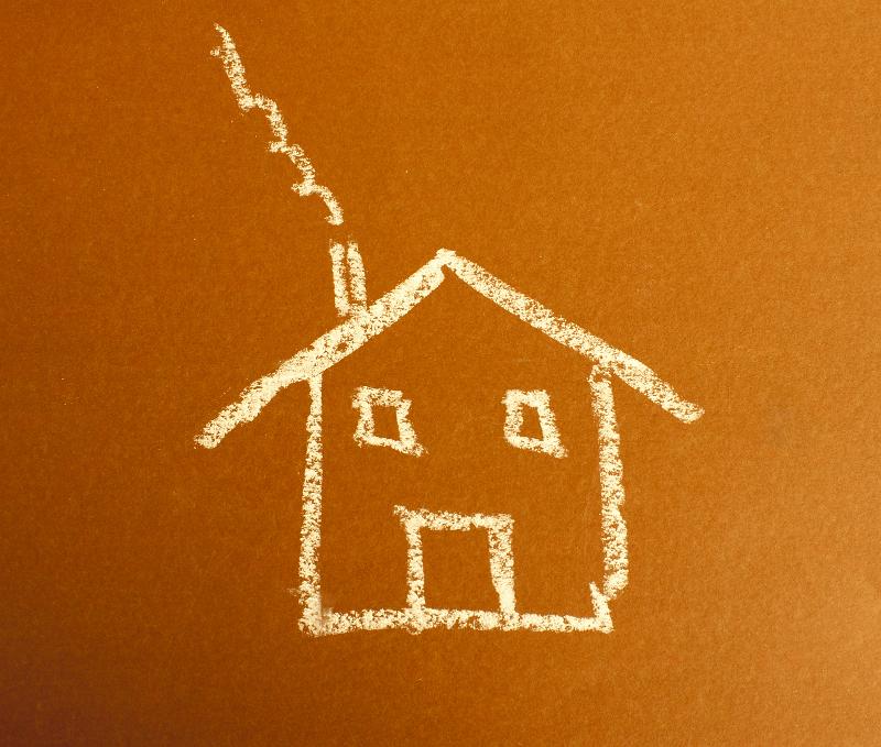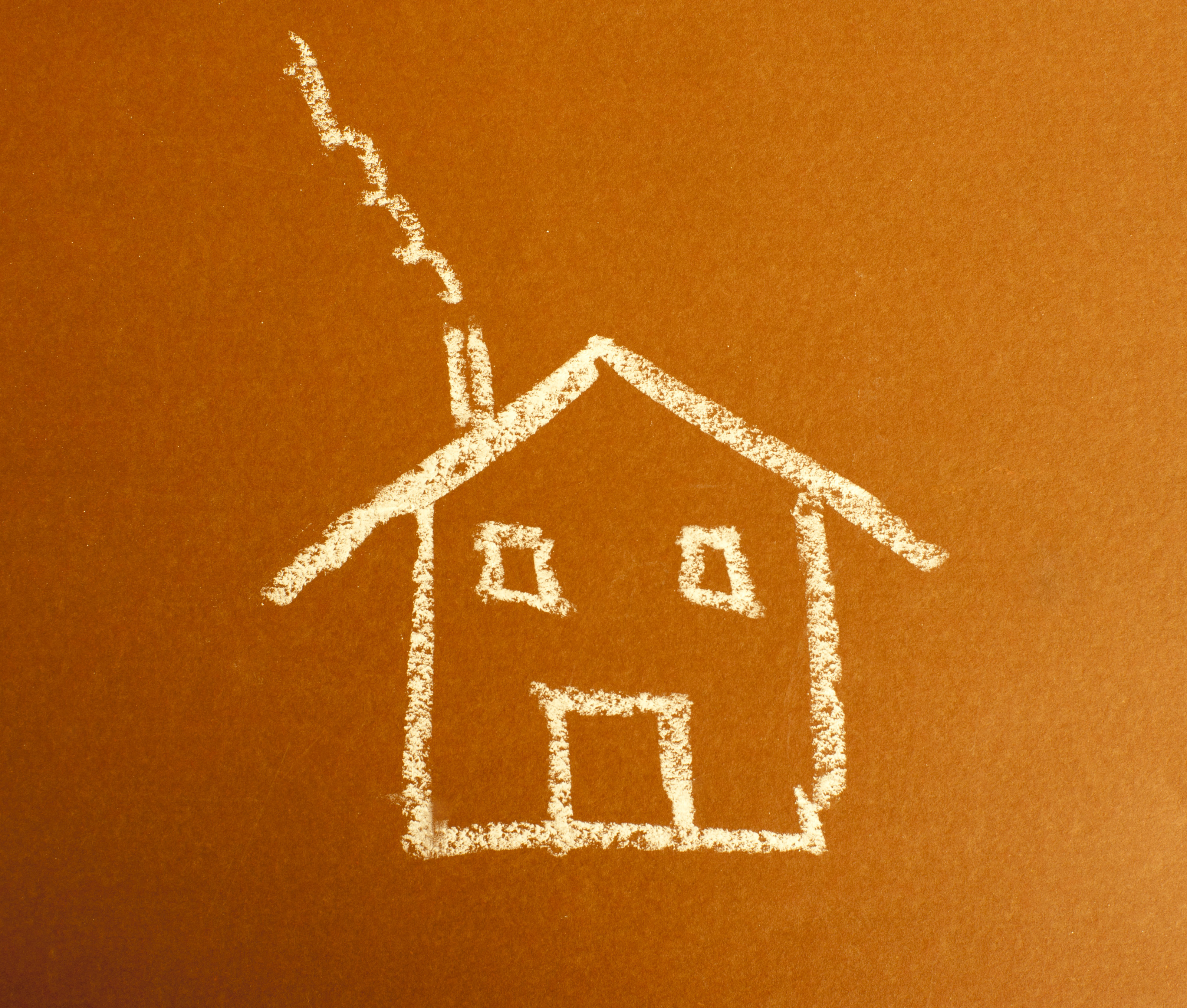 Image Description: a chalk drawing of a childs typical home with windows door and smoking chimney