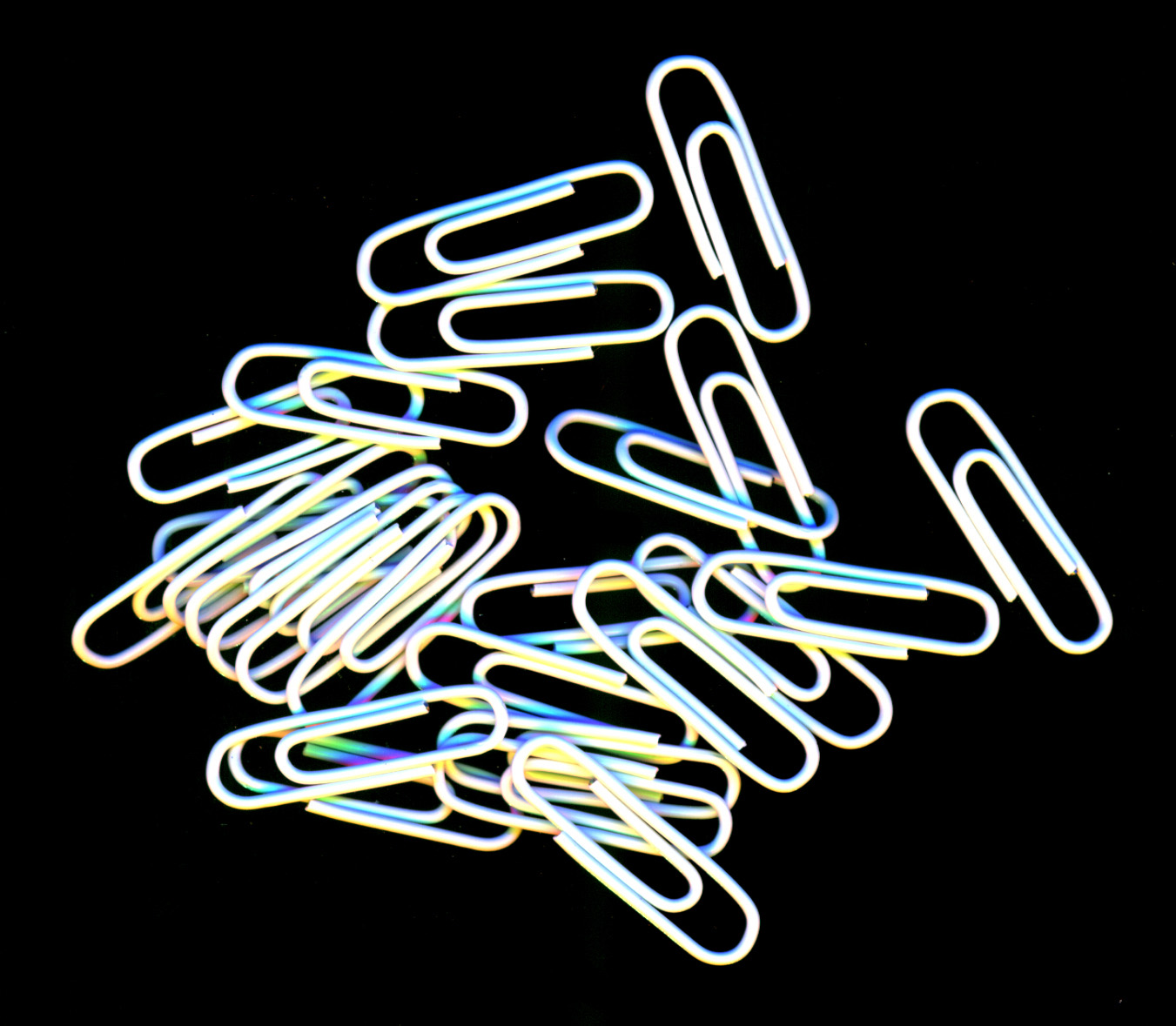 Image Description: Scattered pile of white paperclips for filing documents and making attachments lying on a black background, overhead, view