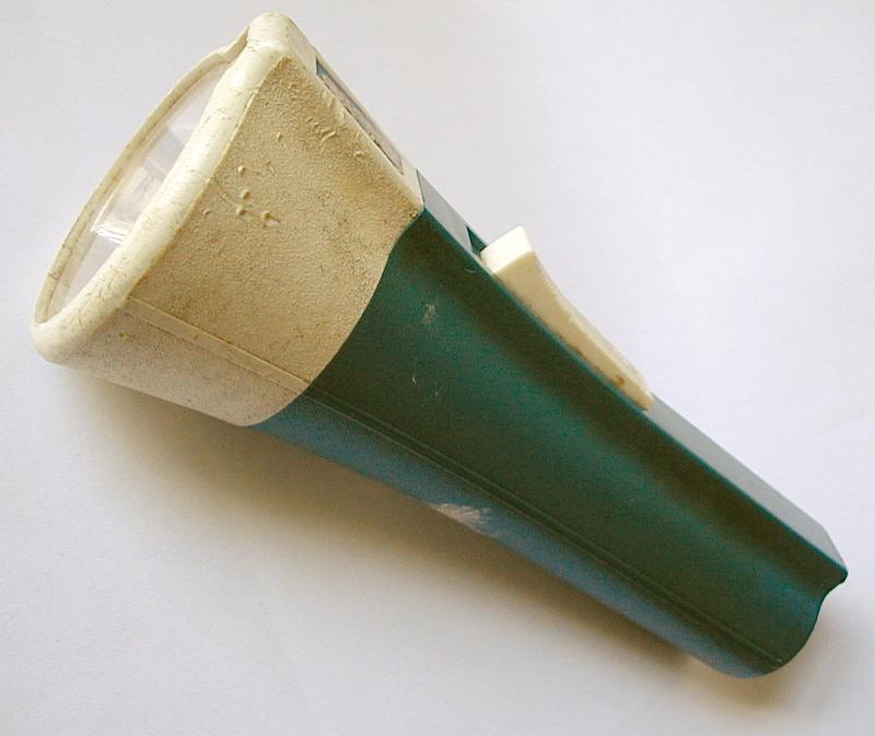 Image Description: Green and white torch or flashlight with a large lens and switch placed diagonally on a white background with copyspace