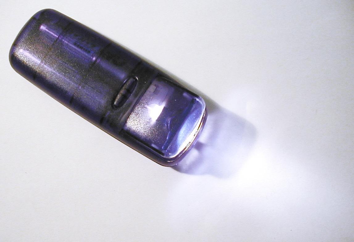 Image Description: Illuminated torch throwing a beam of light across a light grey surface orientated diagonally through the frame