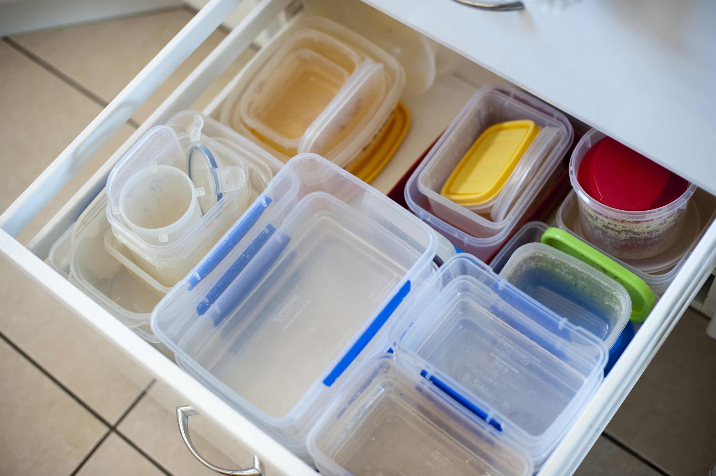 Image Description: Open drawer in a kitchen unit used for storage and filled with neatly arranged plastic storage containers for food
