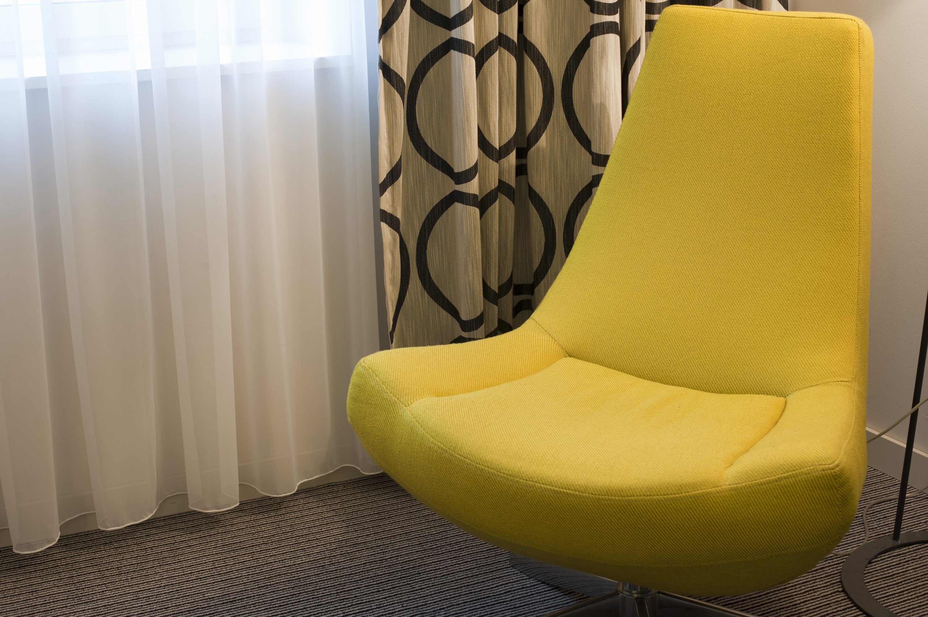 Image Description: Stylish retro styled yellow bucket chair in a modern living room with bold patterned drapes in an interior decor concept