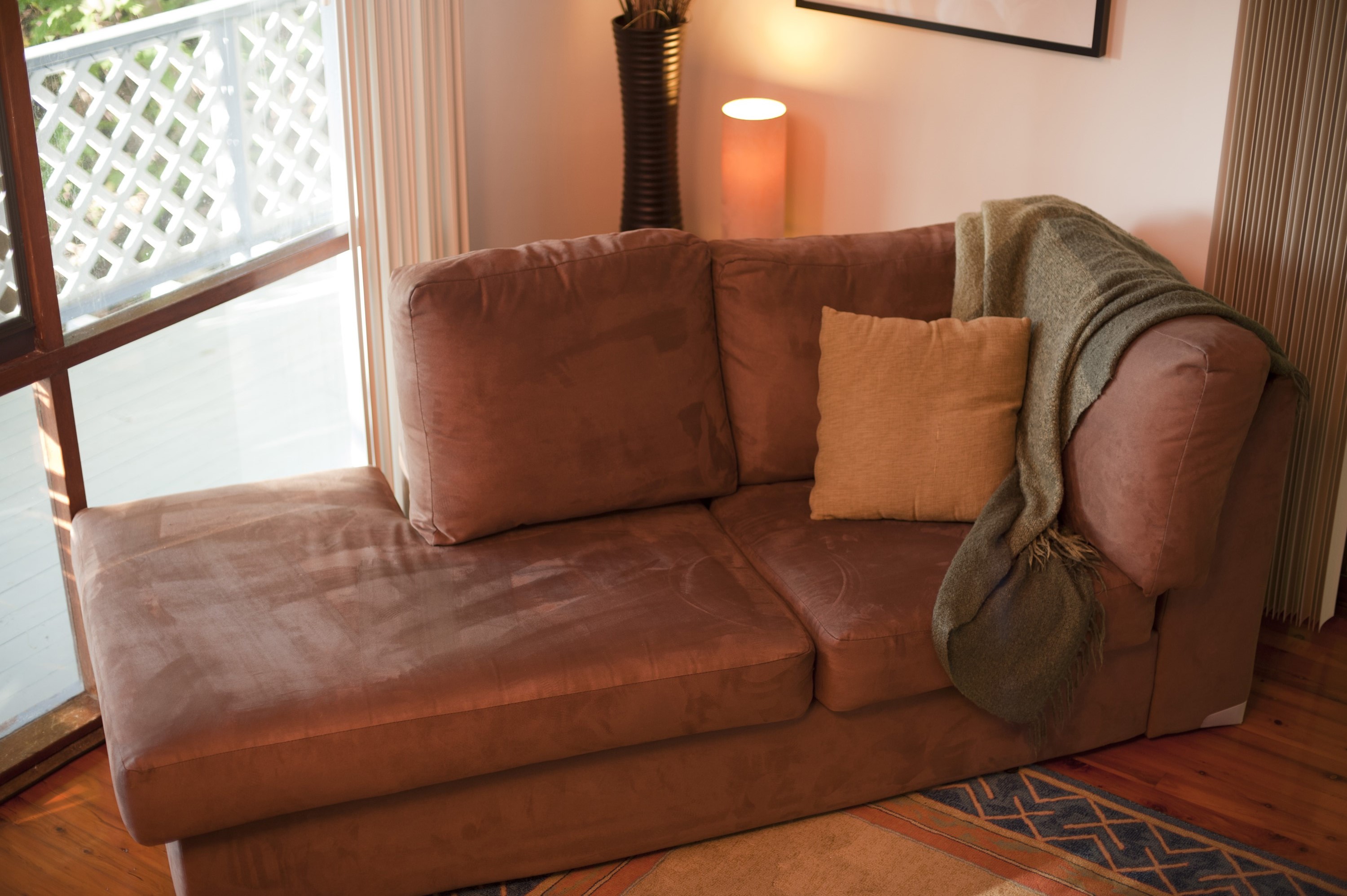 Image Description: Comfortable day bed style couch in front of a large window overlooking a balcony, high angle view