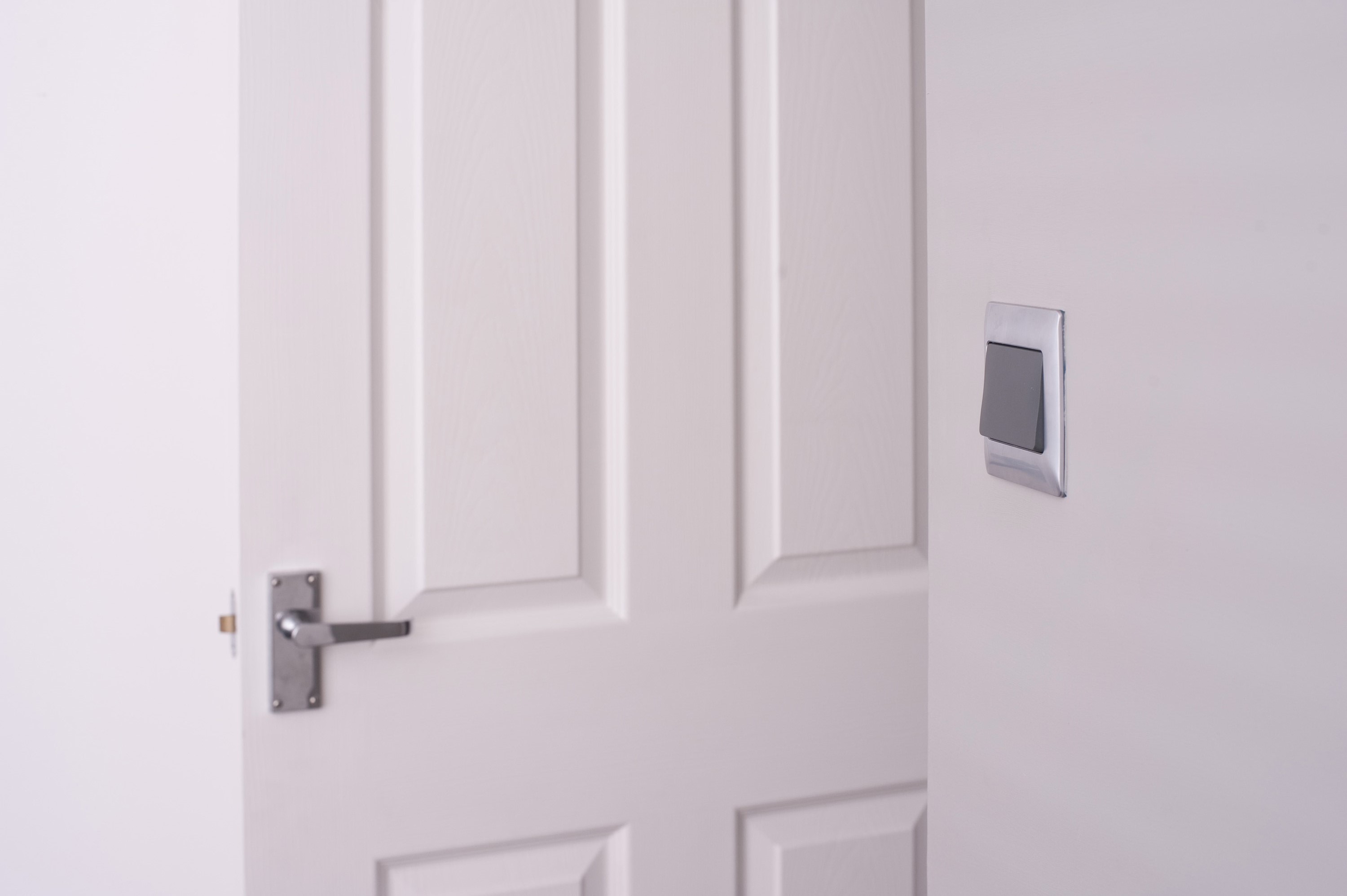 Image Description: Open white wooden paneled door with an electric light switch on the wall alongside it and a metal door handle