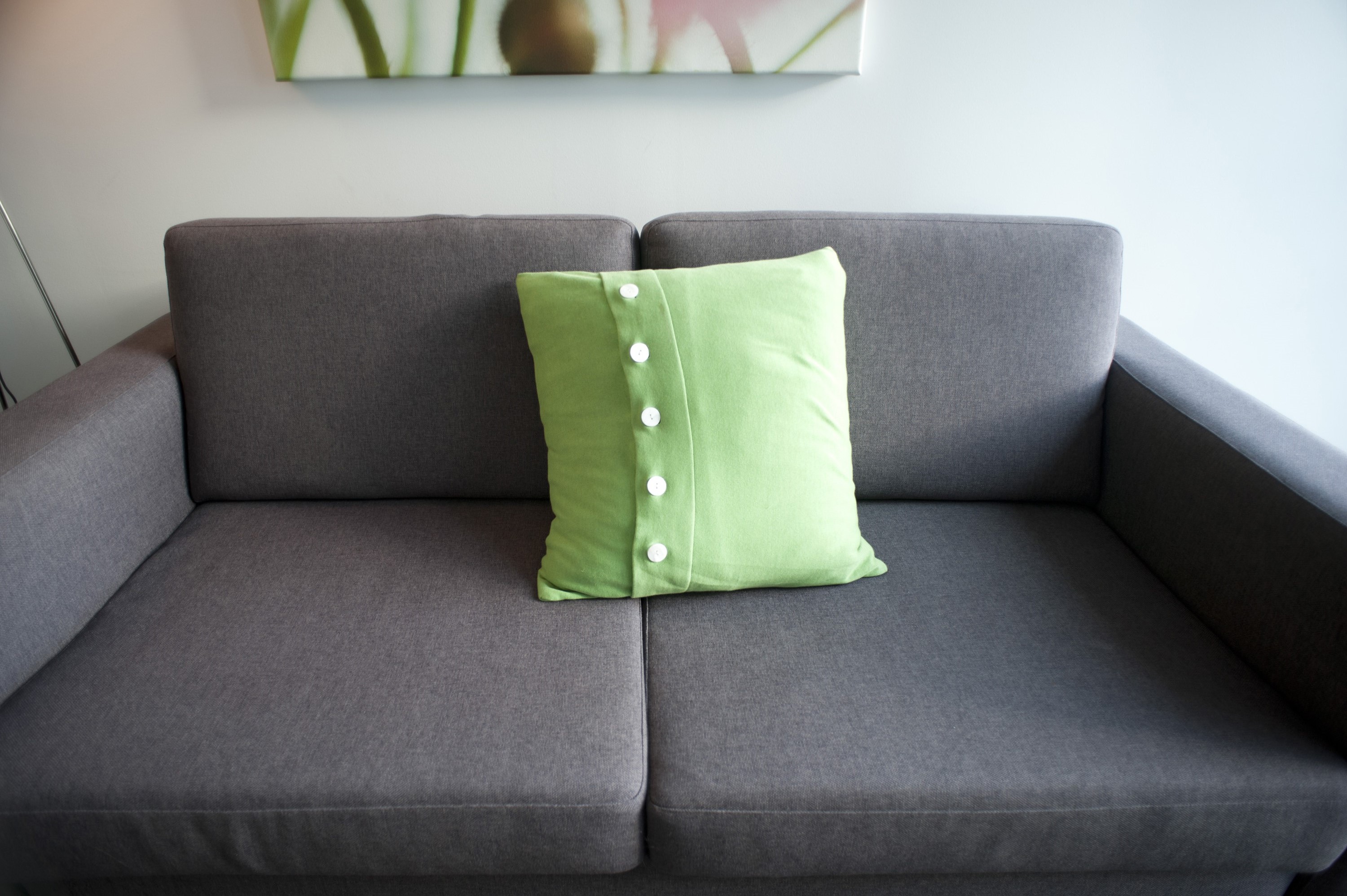 Image Description: a plain grey sofa with a single green cushion and lots of space for copy