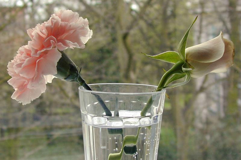 Image Description: Single pink rose and carnation in a glass vase, close up view against a window with a garden view