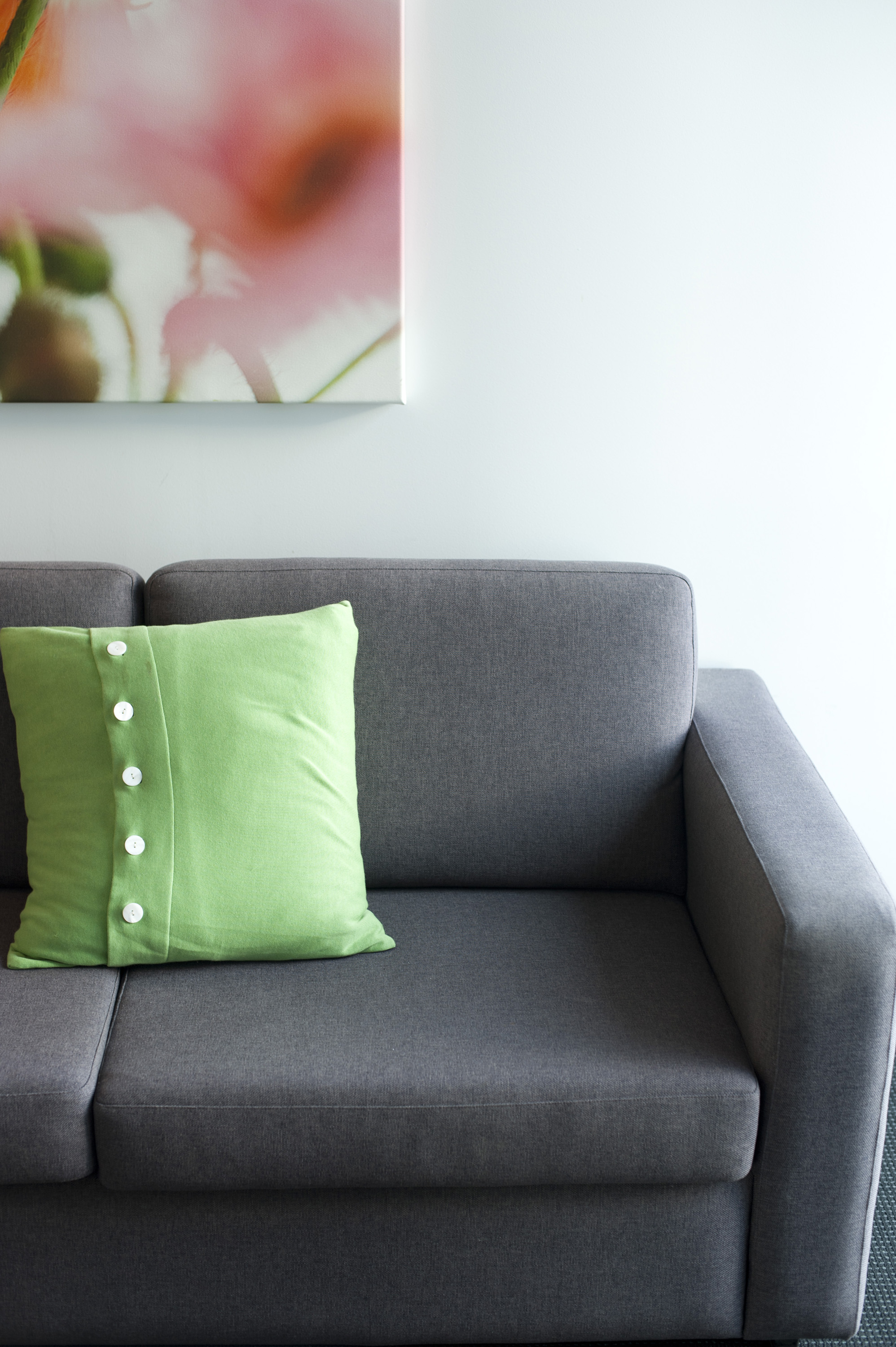 Image Description: Green cushion on a vacant modern upholstered grey couch, close up view
