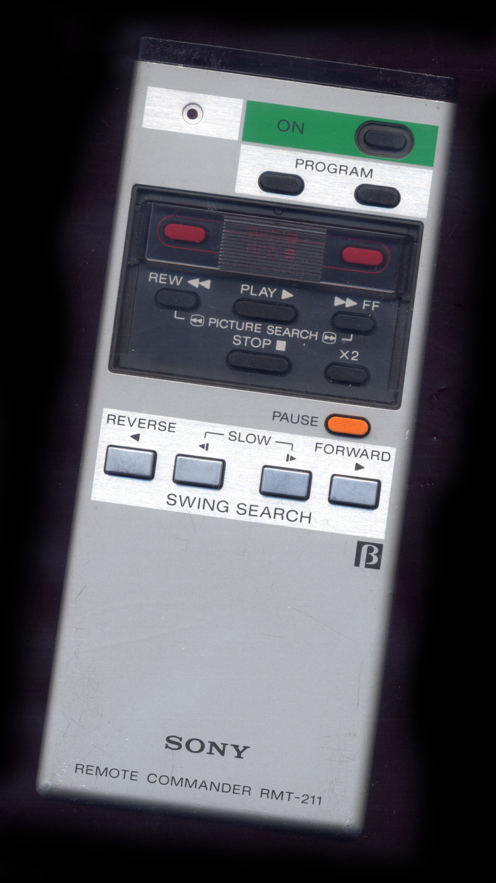 Image Description: Remote control for a home beta video recorder overhead view on a black background