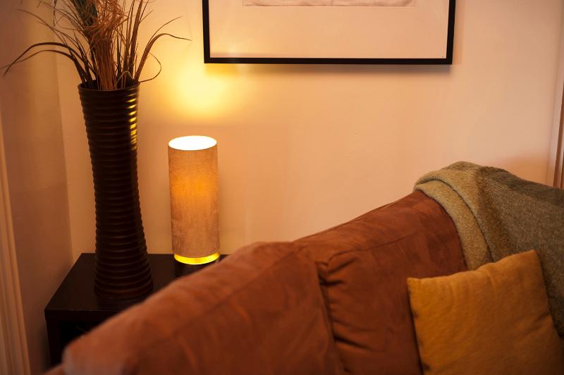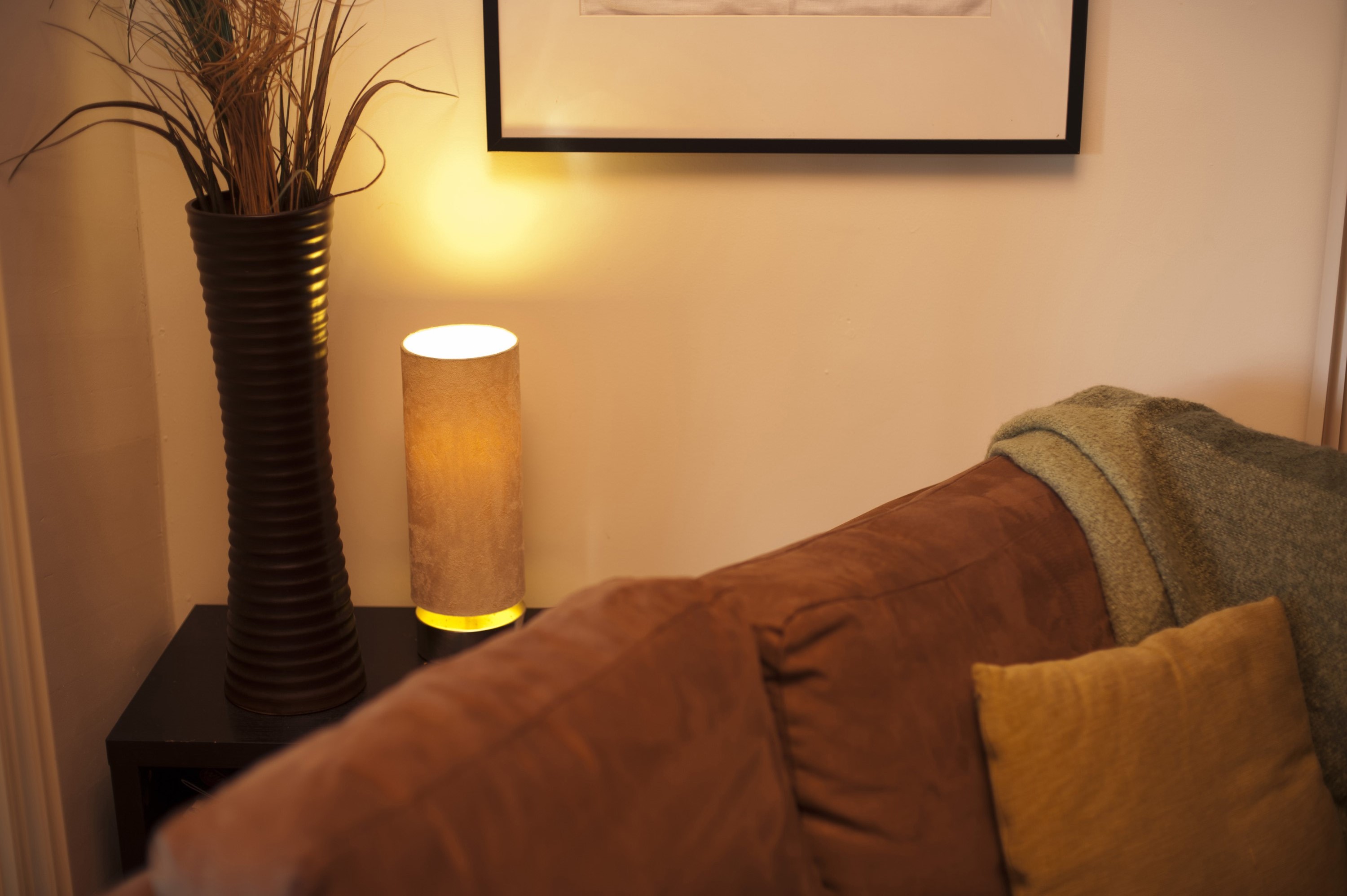 Image Description: Lounge interior decor with a view over the back of a sofa of a modern illuminated cylindrical lamp below a dried flower arrangement