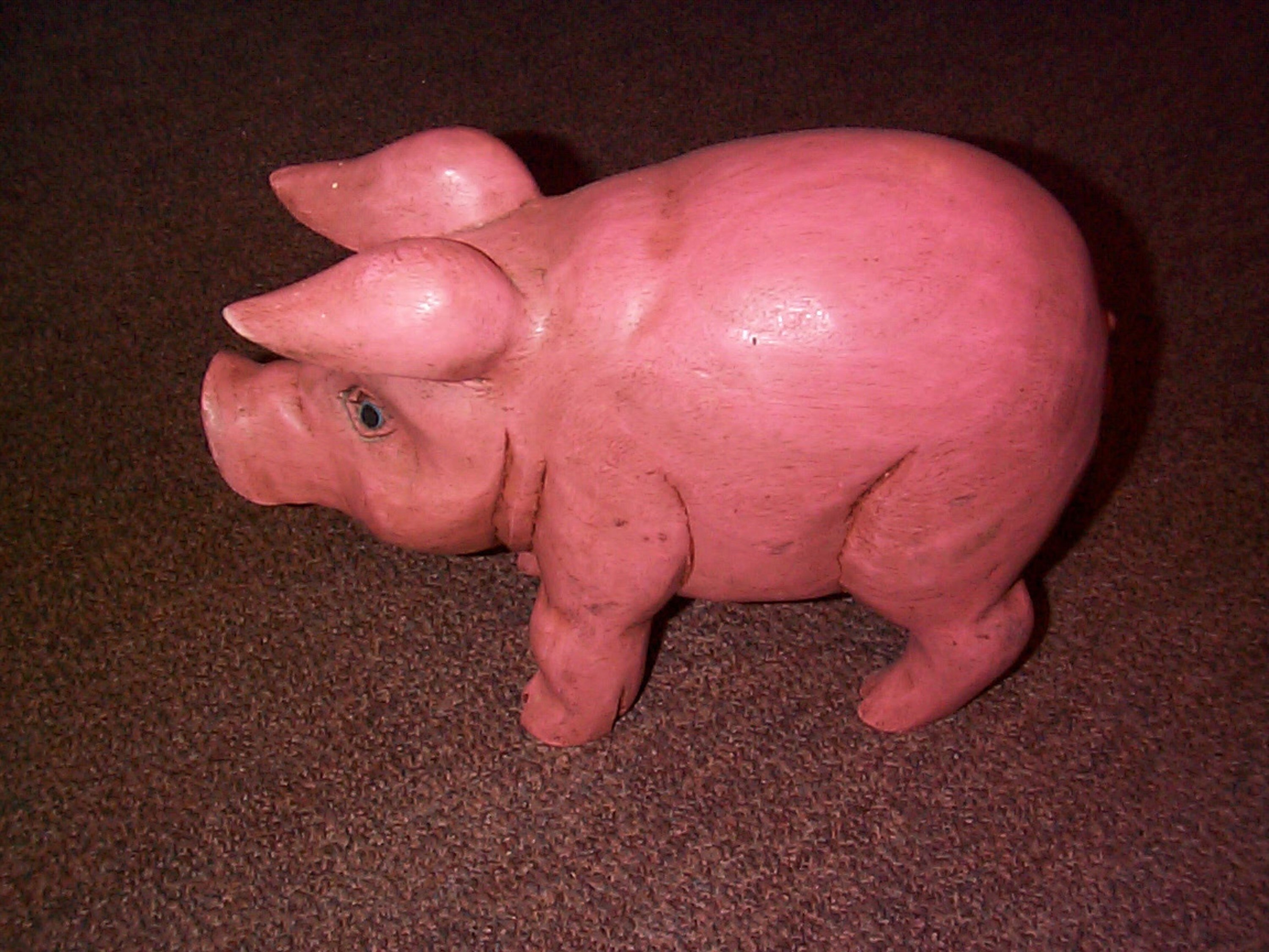 Image Description: Naturalistic carved cute pink wooden pig ornament, high angle view standing sideways to the camera with its ears cocked forwards