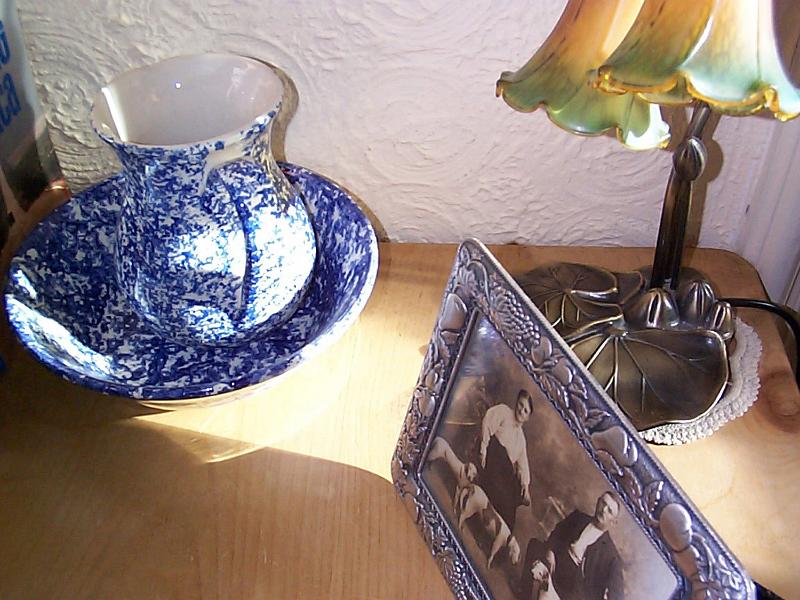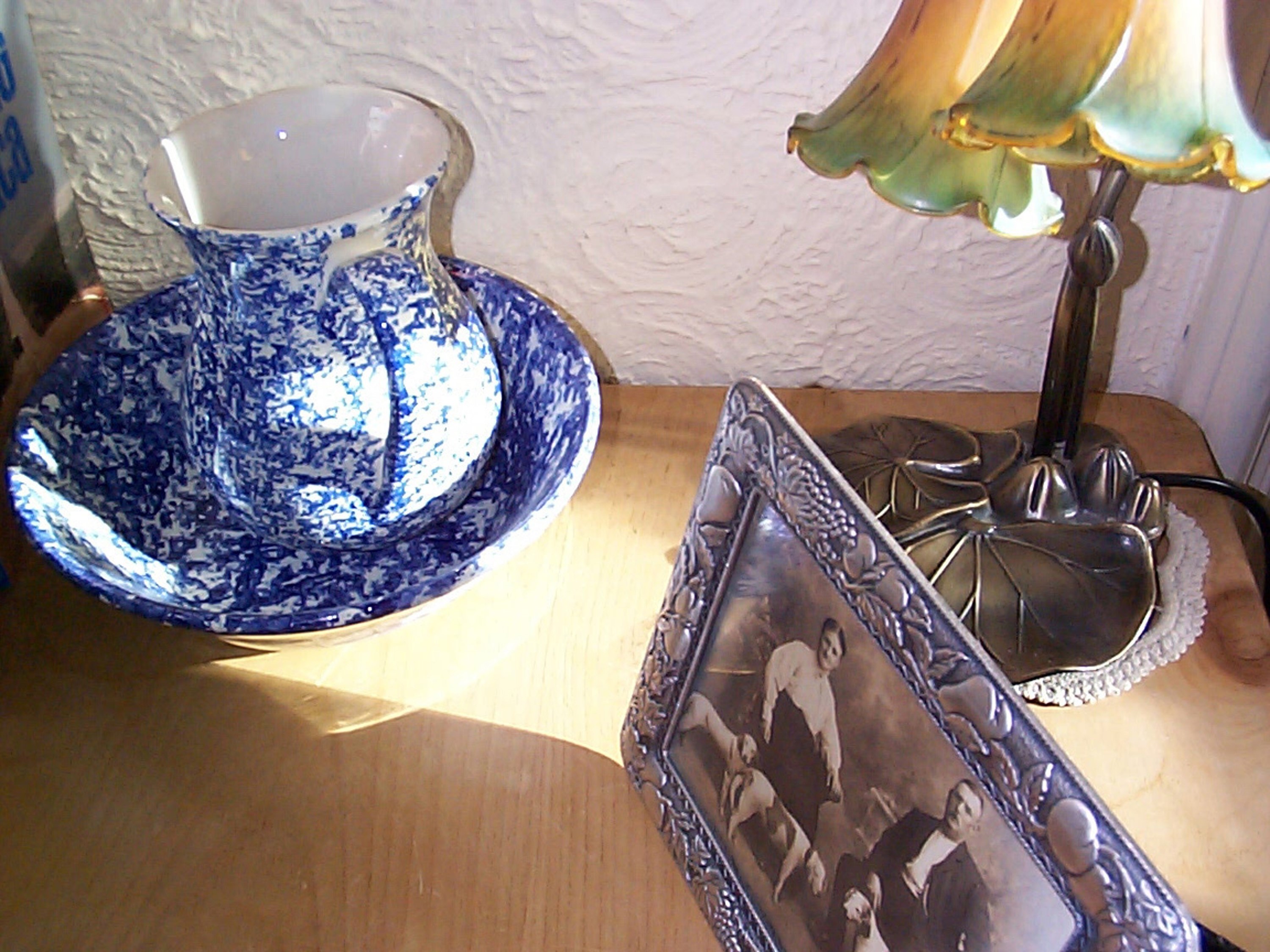 Image Description: Vintage decor with an old blue and white ewer and bowl, sepia family portrait and Art Nouveau style lamp standing on a wooden table top